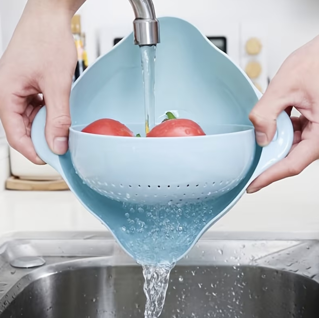 آبکش شستوشوی میوه و سبزیجات دوجداره دارای سبد فیلتر چرخان و سبد تخلیه آب که آب را بدون ریختن اضافی تخلیه میکند