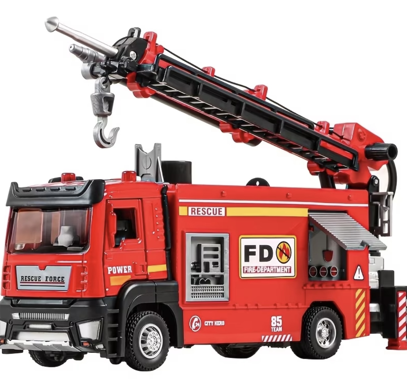 اسباببازی شبیهسازیشده سهکاره کامیون آتشنشانی با کابین فلزی، قابلیت بالابری، یدککشی و پاشیدن آب، مجهز به چراغ و موزیک