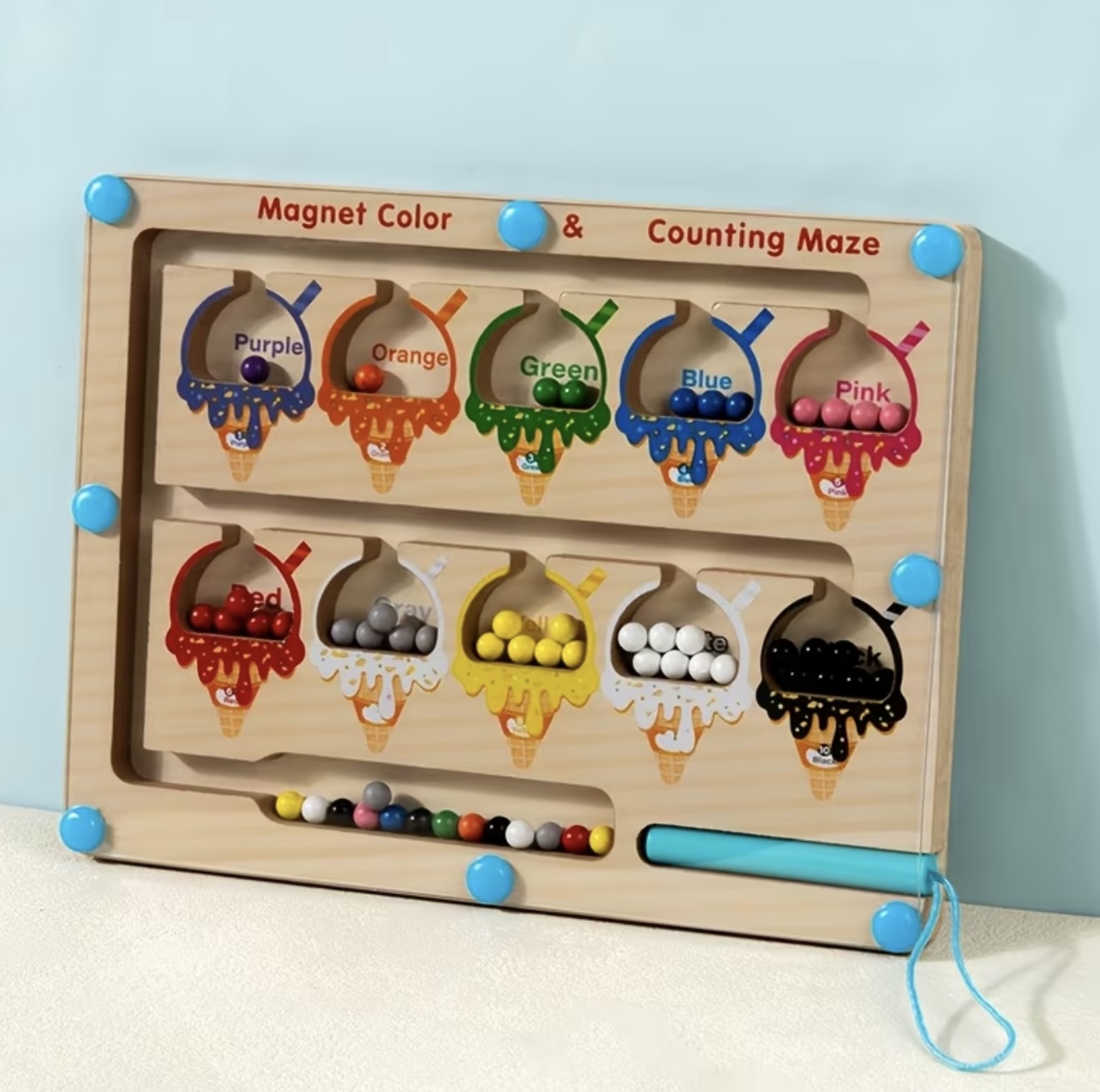 بازی آموزشی بستنی؛ تخته شمارش و دستهبندی رنگها دارای مهرههای مغناطیسی و مکانیزم جابهجایی مهرهها، کمک به یادگیری رنگها، شمارش و تقویت هماهنگی دست و چشم،