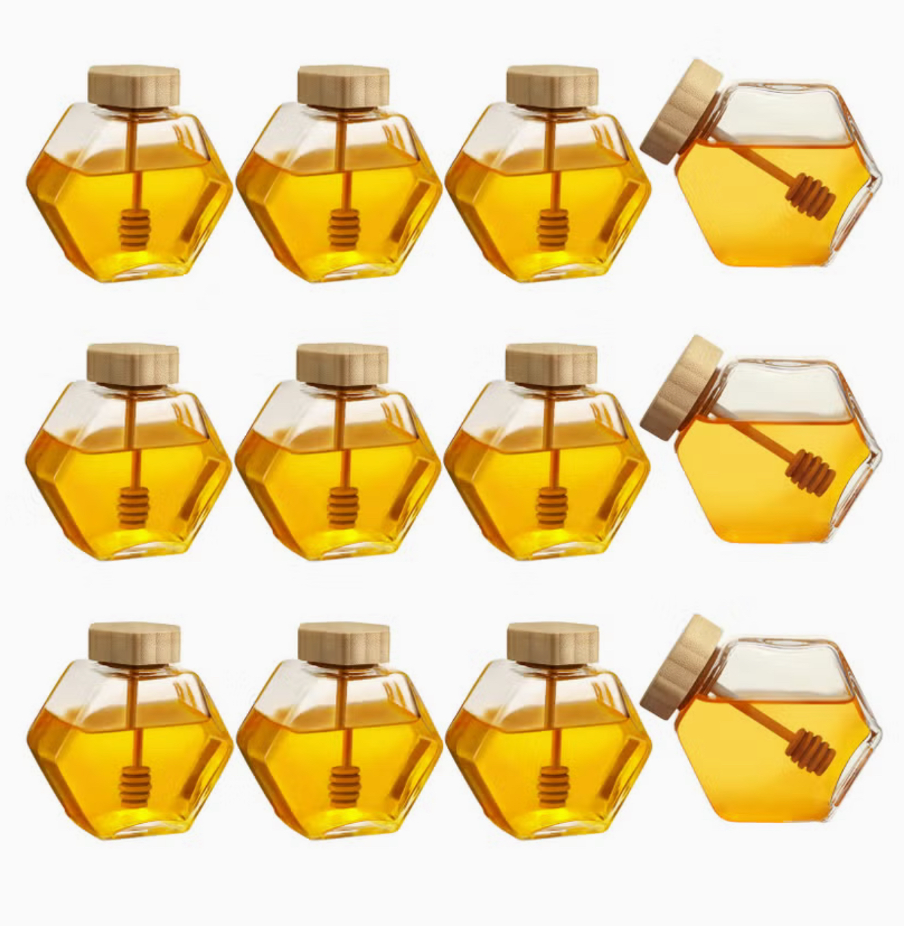 بسته ۱۲ عددی شیشه عسل با در بامبو و قاشق چوبی طراحی شش‌ضلعی شفاف، مناسب برای نگهداری عسل