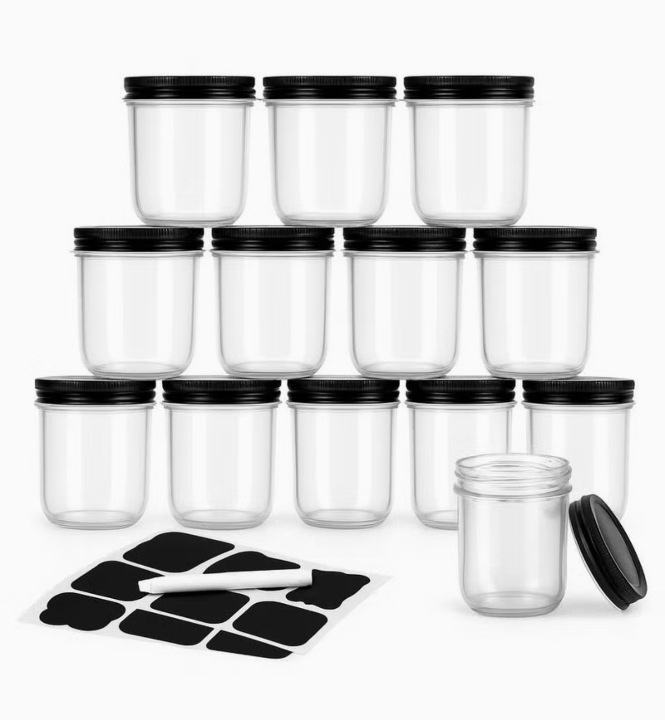 بسته ۱۲ عددی شیشه میسون ۱ با درب‌های مشکی و مناسب برای کنسرو و نگهداری؛ ایده‌آل برای مربا، عسل، ژله، غذای کودک و ادویه‌ها