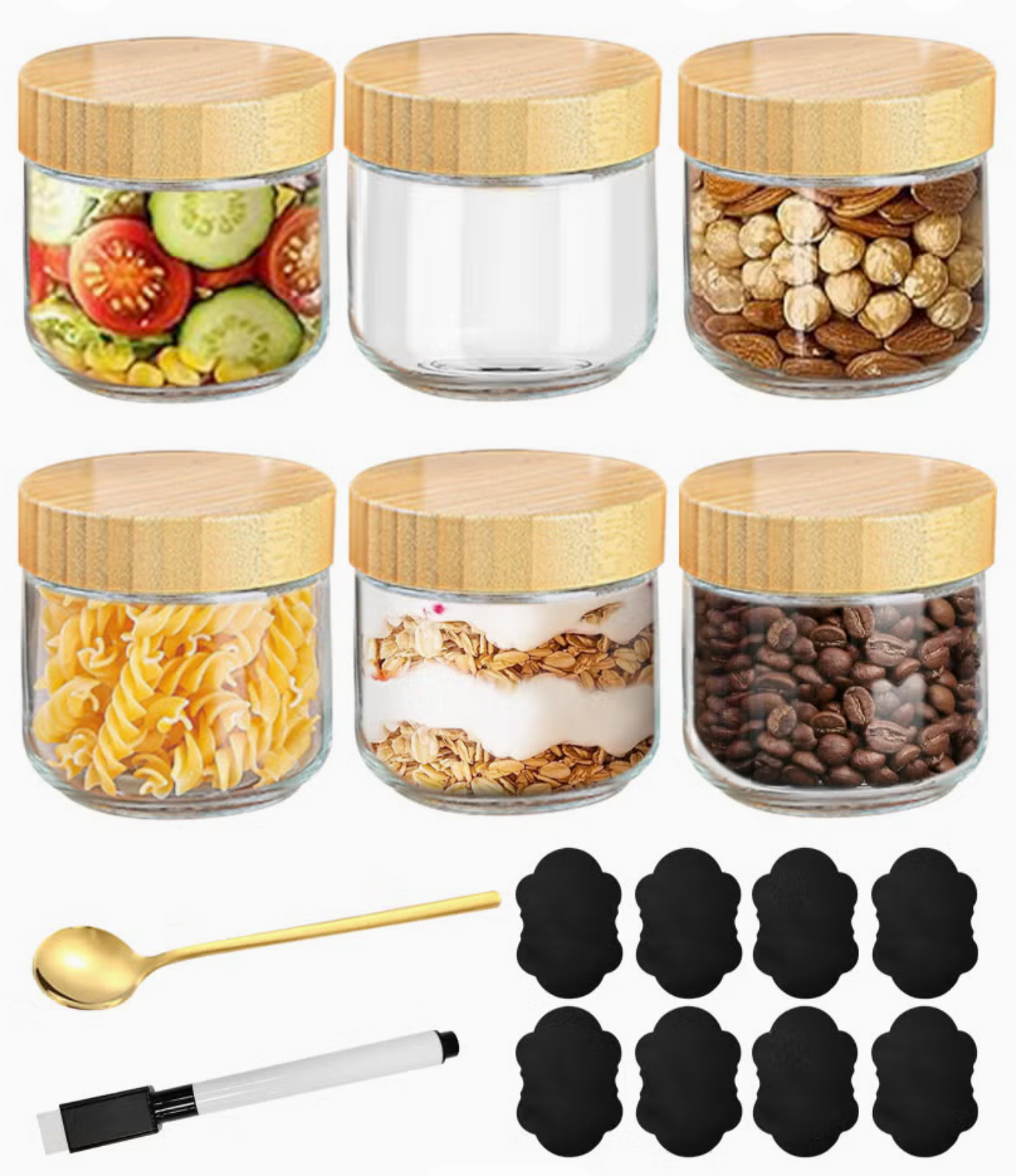 بسته ۶ عددی شیشه ای با درب هوا‌بند بامبو، مناسب برای جو دوسر،حبوبات، همراه با ۱ قاشق، ۱ خودکار و ۸ برچسب تخته‌سیاهی،