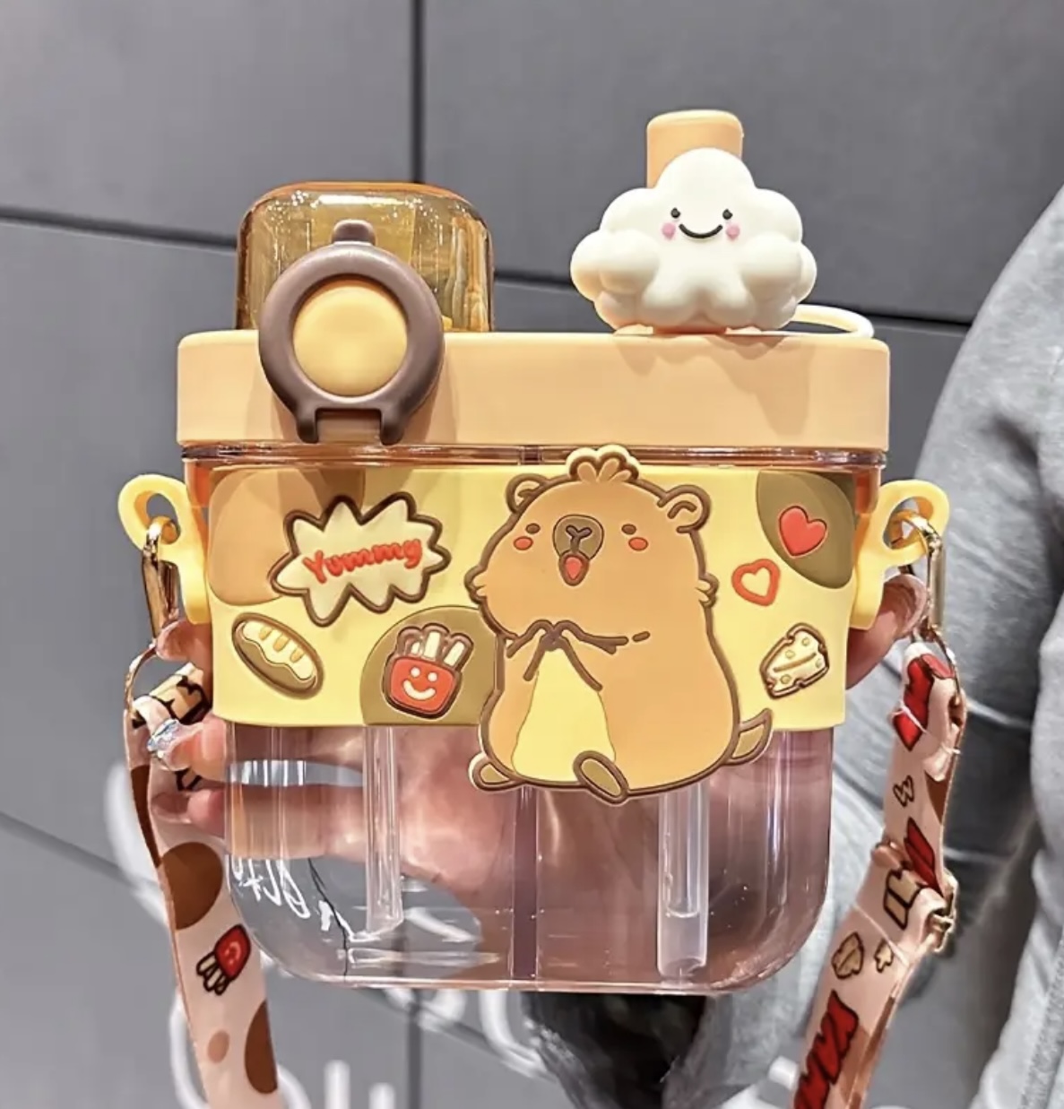 بطری آب مربعی قابلحمل طرح کاپیبارا – طراحی خلاقانه با قابلیت نوشیدن دوگانه، فانتزی، بامزه و استایلیش، ساختهشده از متریال نشکن، مناسب استفاده روزمره، مدرسه، سفر و ورزش