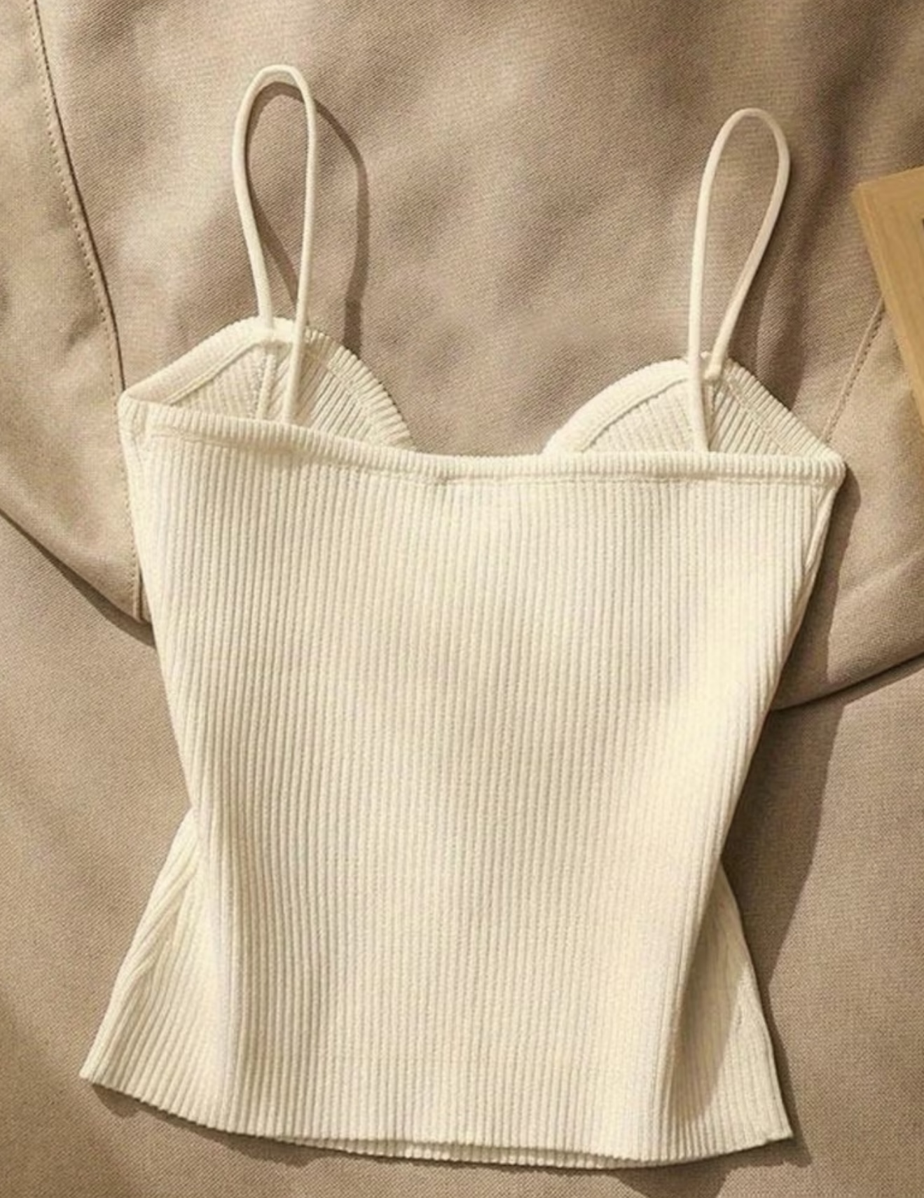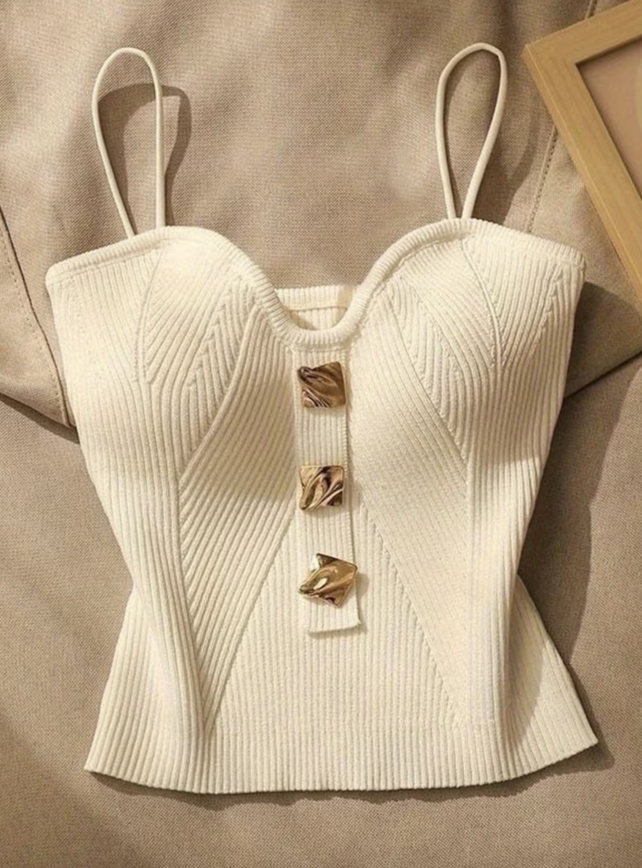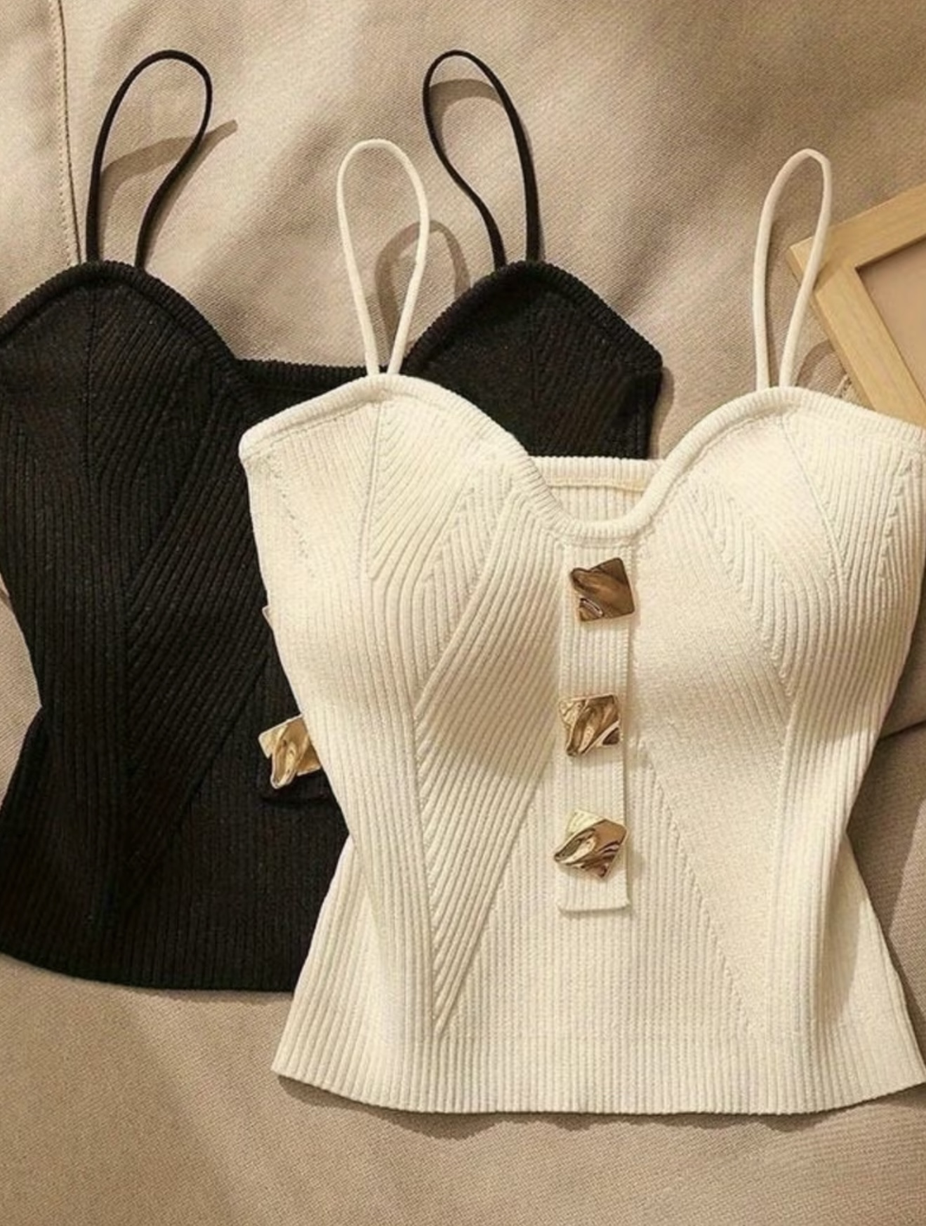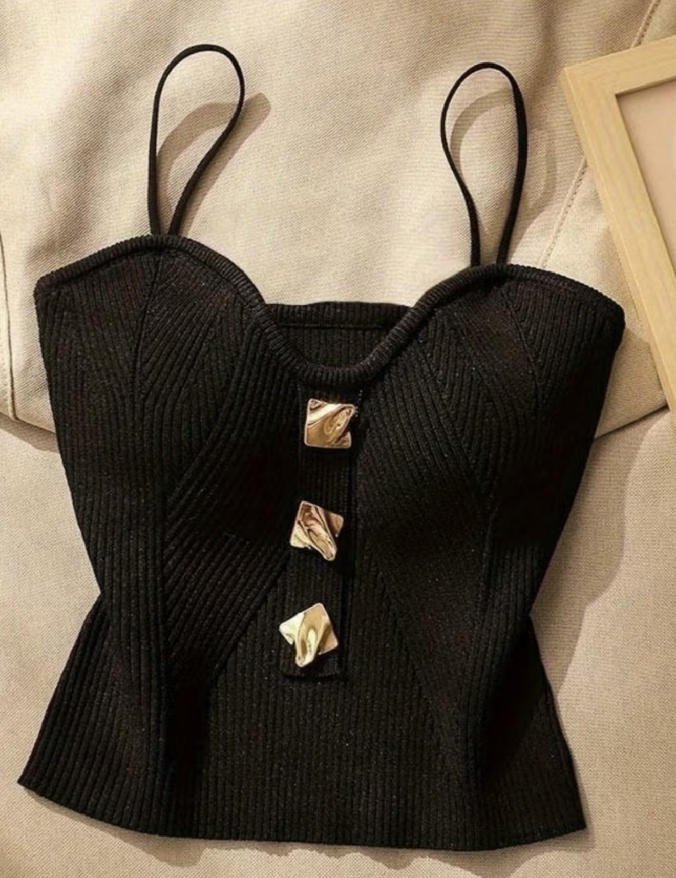 تاپ زنانه بدون آستین با جزئیات دکمه در جلو، طرح بافتدار مشکی، بندهای باریک اسپگتی
