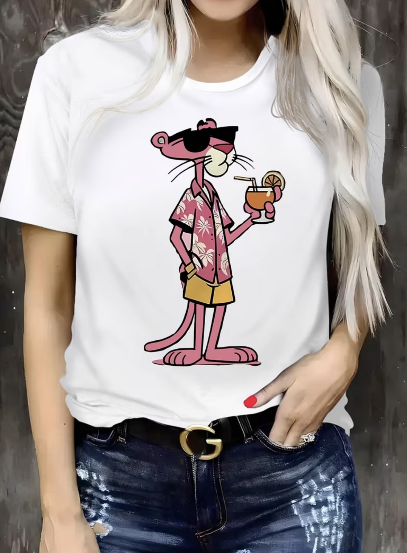 تیشرت زنانه با چاپ کارتونی پلنگ صورتی
