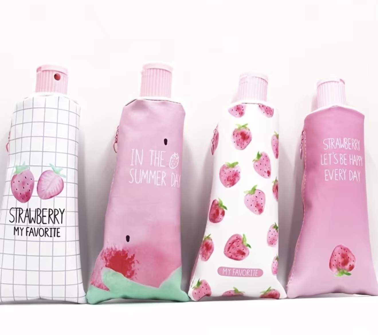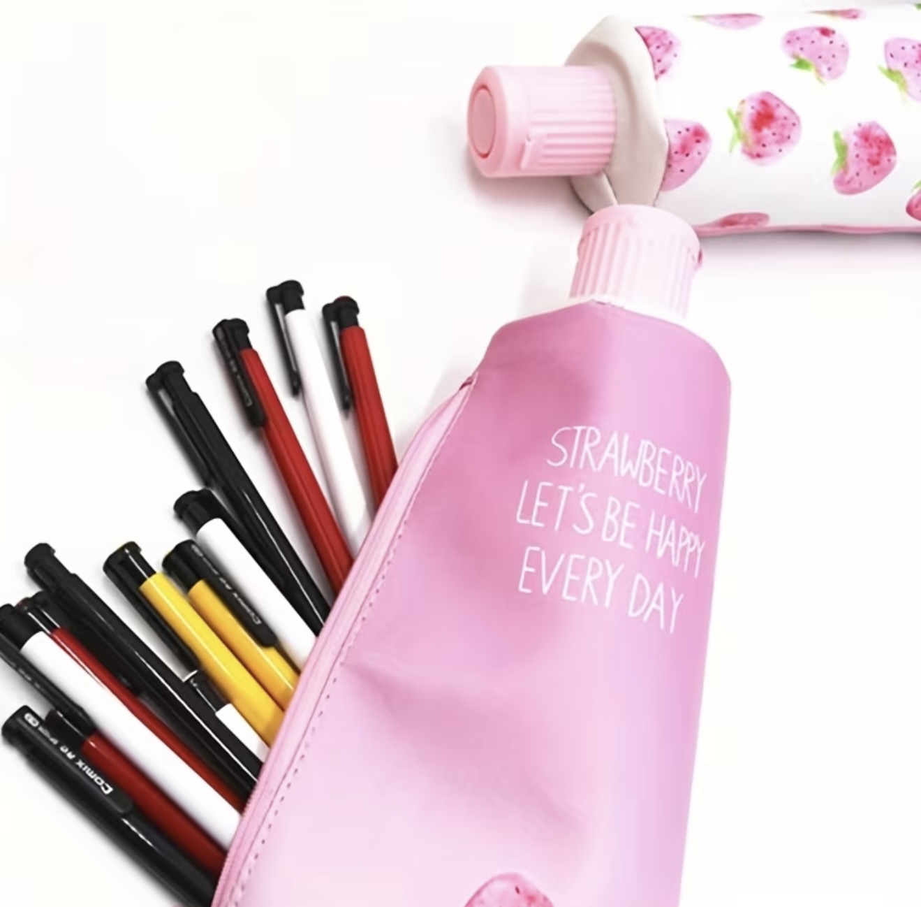 جامدادی به شکل خمیردندان همراه با تراش مداد، با طرح و سبک توت‌فرنگی
