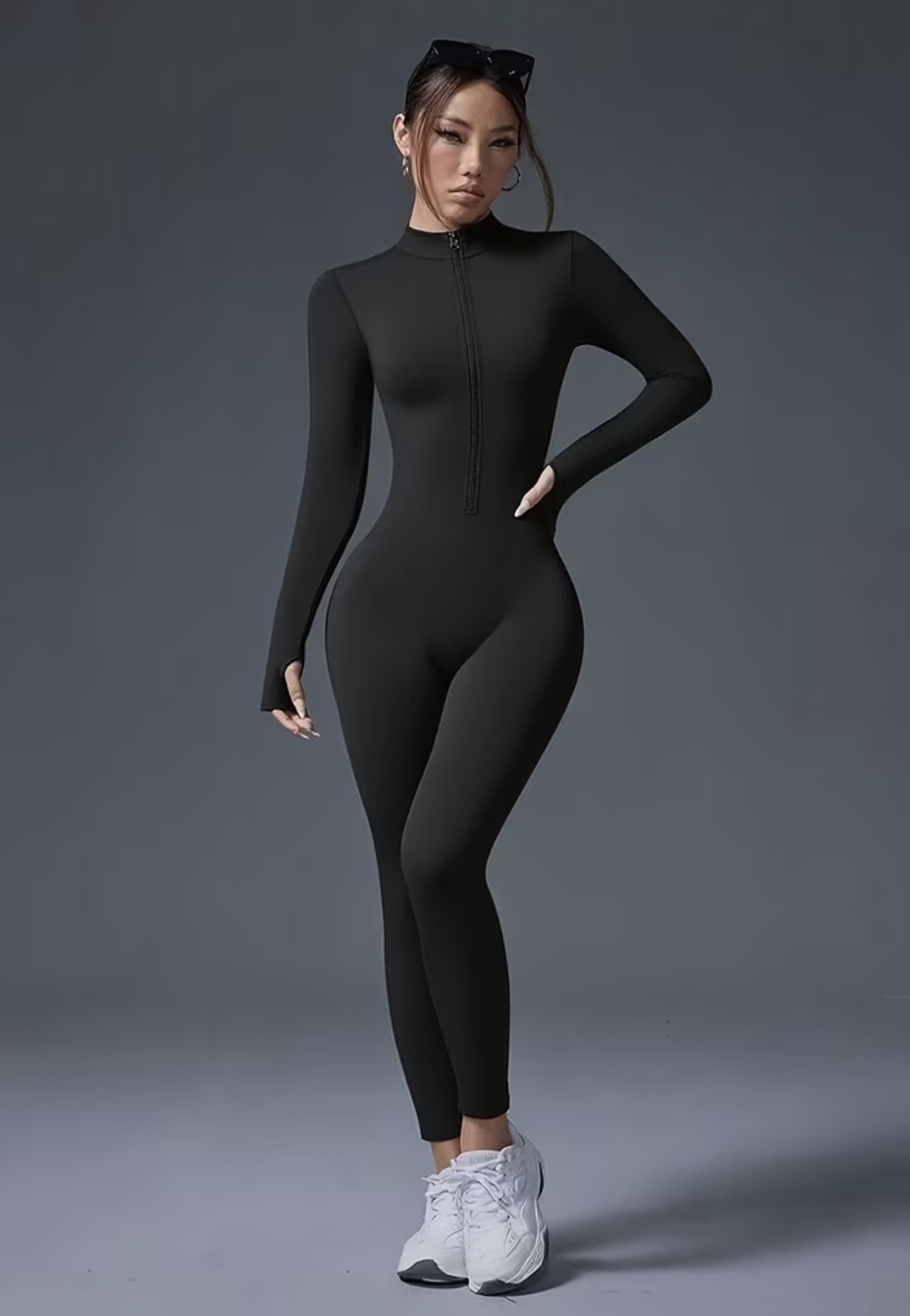جامپسوت زنانه با آستین بلند و زیپ جلو، فرم جذاب