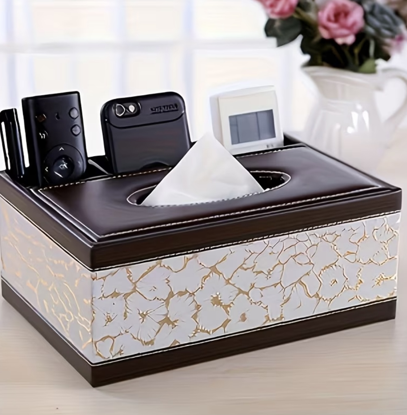جعبه دستمال شیک از چرم مصنوعی با جای ریموت کنترل و ارگانایزر رومیزی