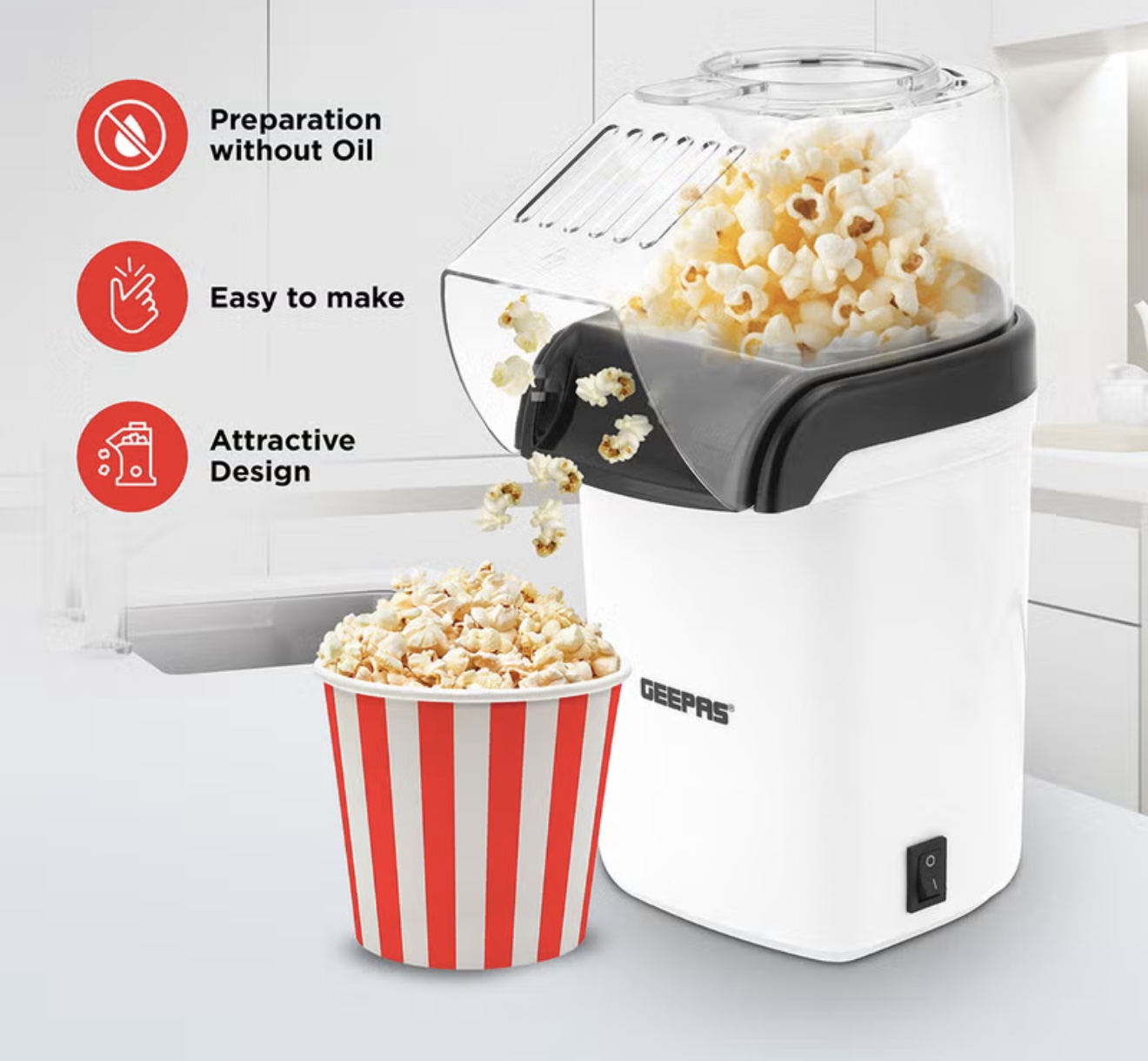 دستگاه برقی پاپ‌کورن | دارای کلید روشن/خاموش | پاپ‌کورن‌ساز بدون نیاز به روغن | تهیه پاپ‌کورن داغ، تازه، سالم و بدون چربی توان: ۱۲۰۰ وات