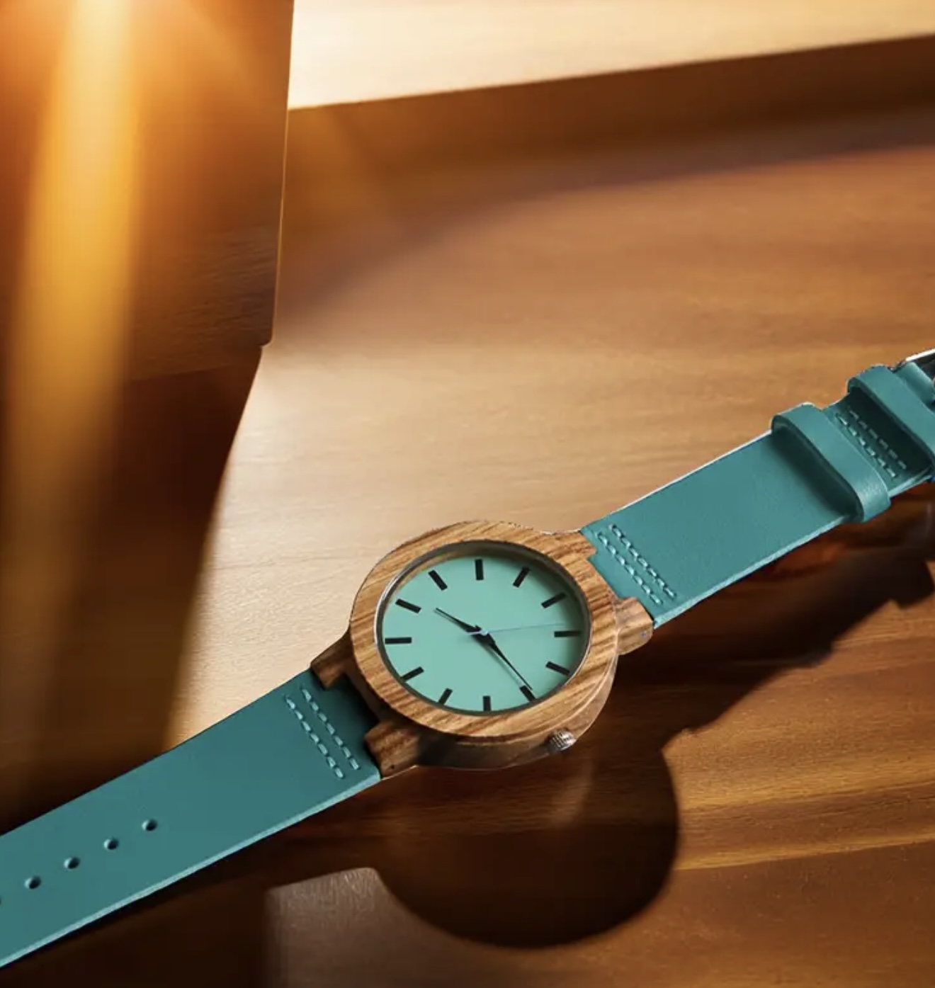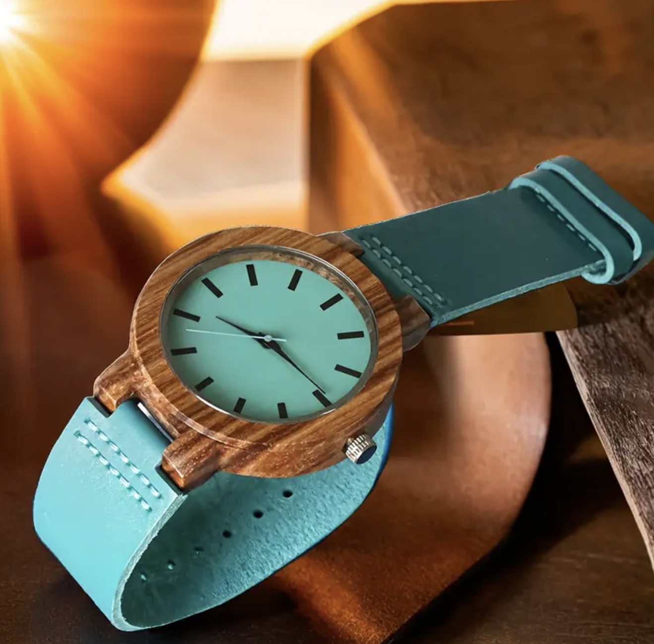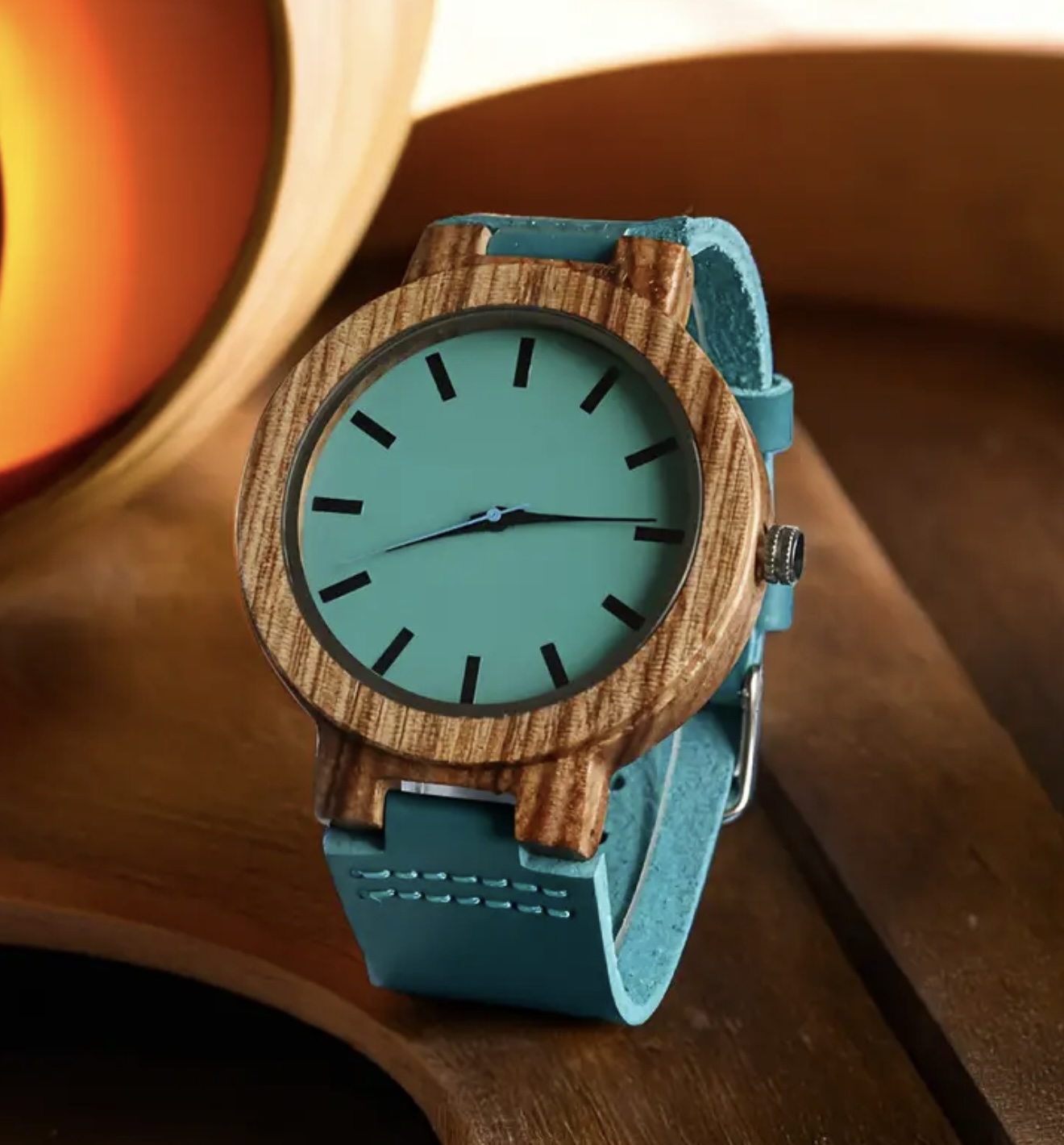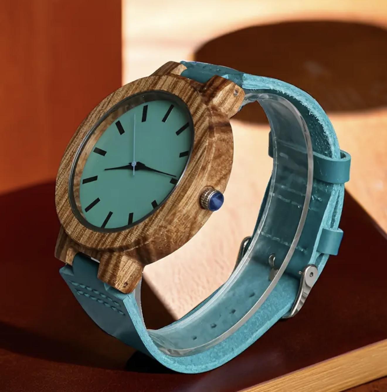 ساعت کوارتز چوبی فشن و کژوال با بند چرمی مصنوعی – دارای صفحه گرد و سگک قابل تنظیم، بند چرمی مصنوعی آبی روشن و قاب چوبی قهوهای، اعداد خوانا، مناسب استفاده روزمره، ساعتی شیک و باوقار