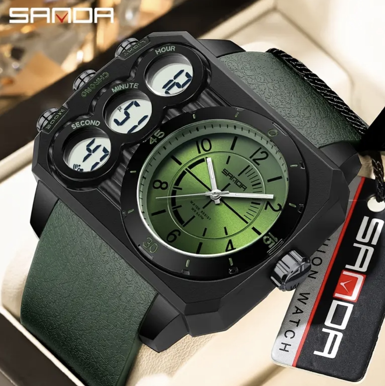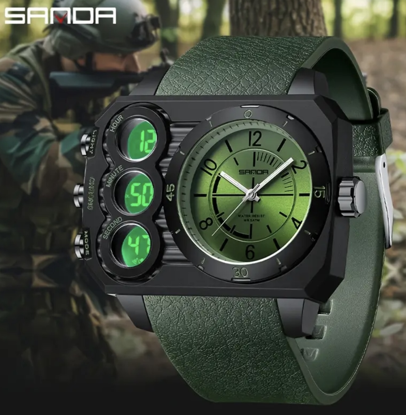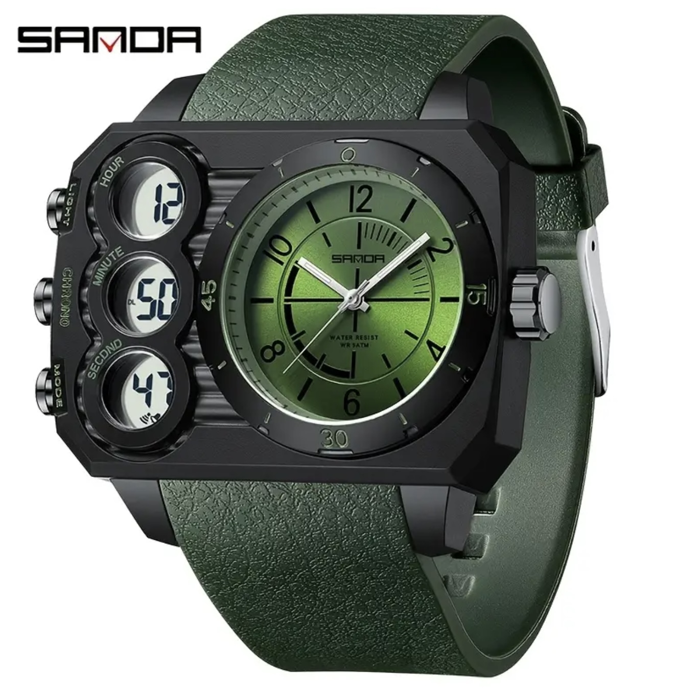 ساعت SANDA با نمایش دوگانه و صفحه بزرگ – کیفیت بالا تا عمق ۵۰ متر، دارای کرنومتر، آلارم و قابلیت نمایش دو منطقه زمانی، ساعت ورزشی لوکس مناسب شنا، باشگاه و استفاده روزمره، صفحه با جزئیات سبز. هدیهای ایدهآل برای آقایان، ساعت باشگاهی، اکسسوری مدرن و شیک، ردیاب فیتنس، ساعت قابل اعتماد و مناسب سبک زندگی فعال