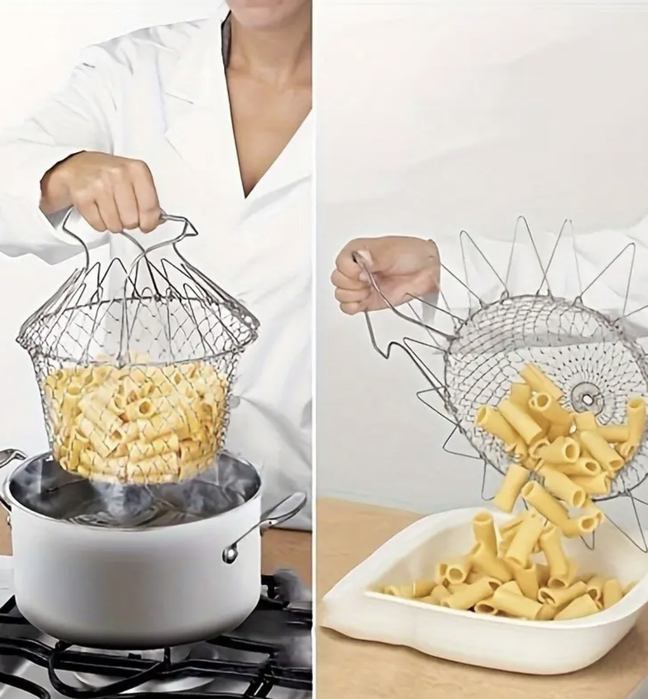 سبد سرخکردنی تاشو استیل ضدزنگ – صافی و ابزار چندمنظوره آشپزخانه برای سرخ کردن، گرفتن روغن اضافه و حتی سرو و نمایش میوهها، با طراحی توری مقاوم و بادوام، ایدهآل برای سیبزمینی سرخکرده، سبزیجات و انواع مواد غذایی دیگر