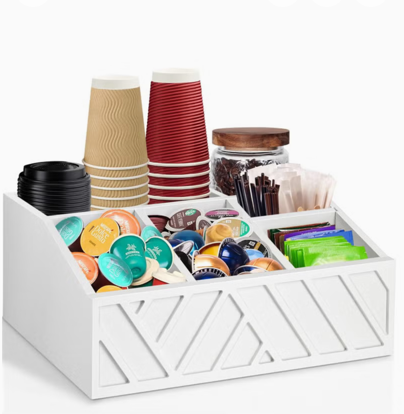 سبد چوبی نگهداری کپسولهای قهوه و لوازم جانبی قهوه، مناسب برای شکر، چای، اسپرسو، فنجانها، رنگ سفید، ایدهآل برای دکوراسیون