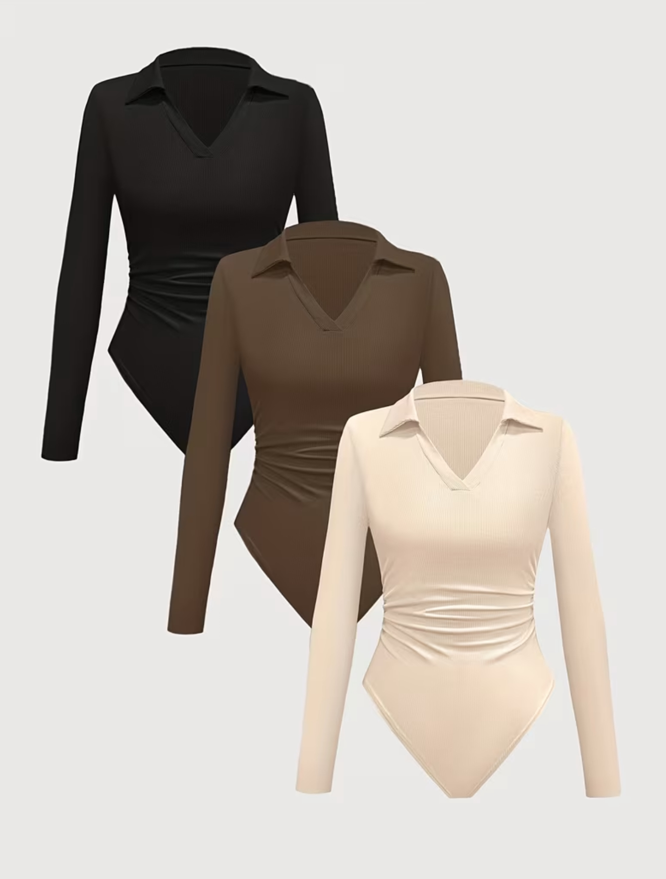 ست۳ تکه بادی آستین بلند با یقه V و یقهدار، از جنس پارچه ریب (بافت کشی)، طراحی جذب (فیت)،
