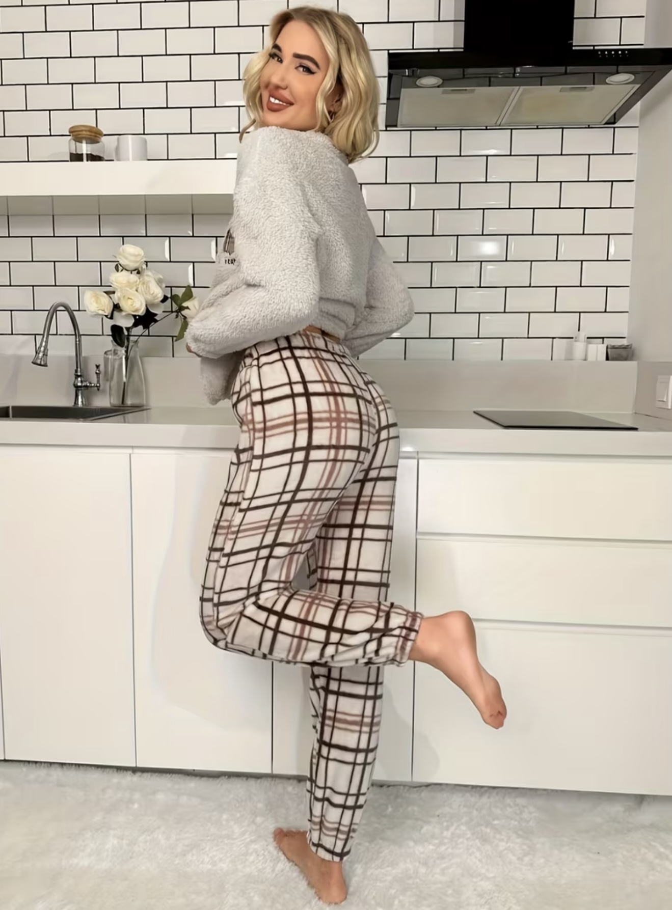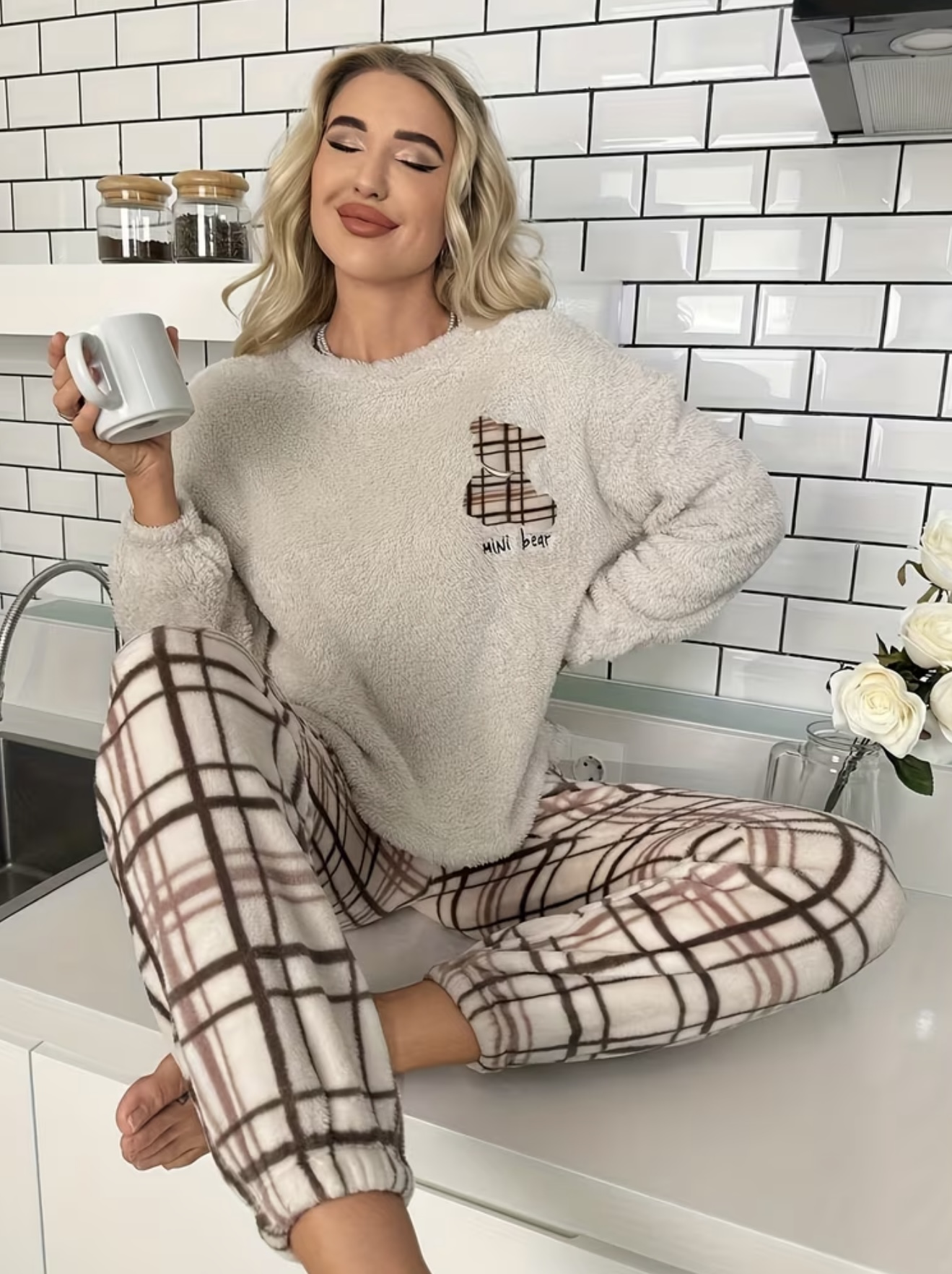 ست خانگی و لباس خواب زنانه و مردانه به سبک ست دونفره، پاییز و زمستان، از جنس مخمل نرم، طرح چهارخانه، شامل آستین بلند و شلوار، با گلدوزی خرسی تصادفی روی بالاتنه
