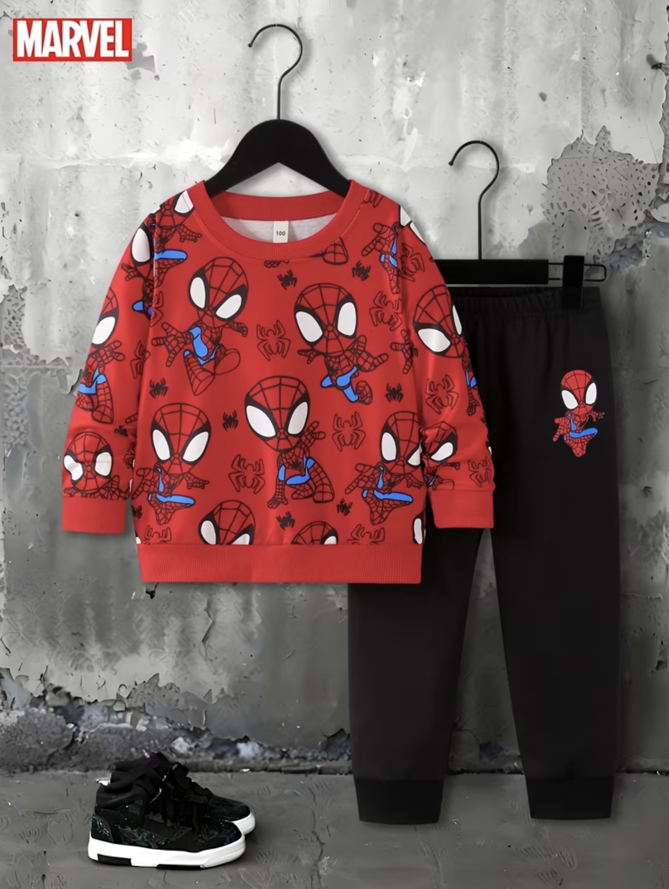 ست دو تکه بچگانه با طرح عنکبوت قرمز شیک شامل بلوز یقه گرد گرم و شلوار مشکی راحت