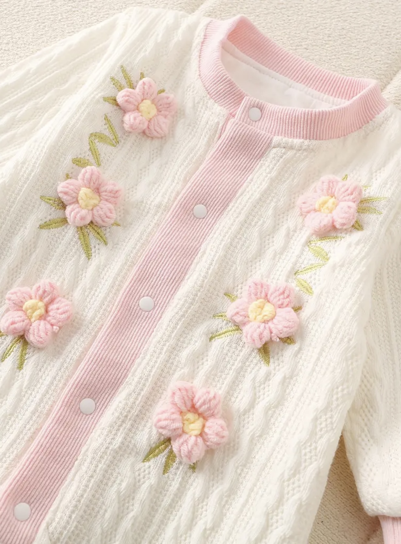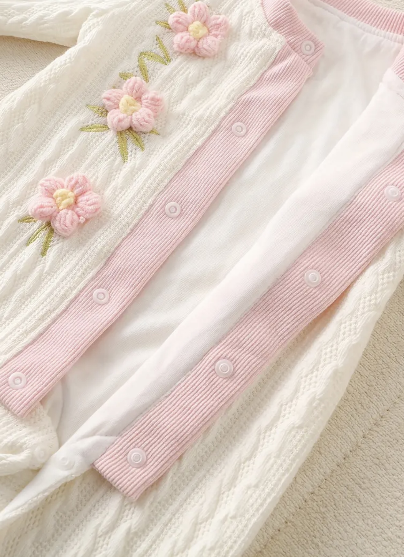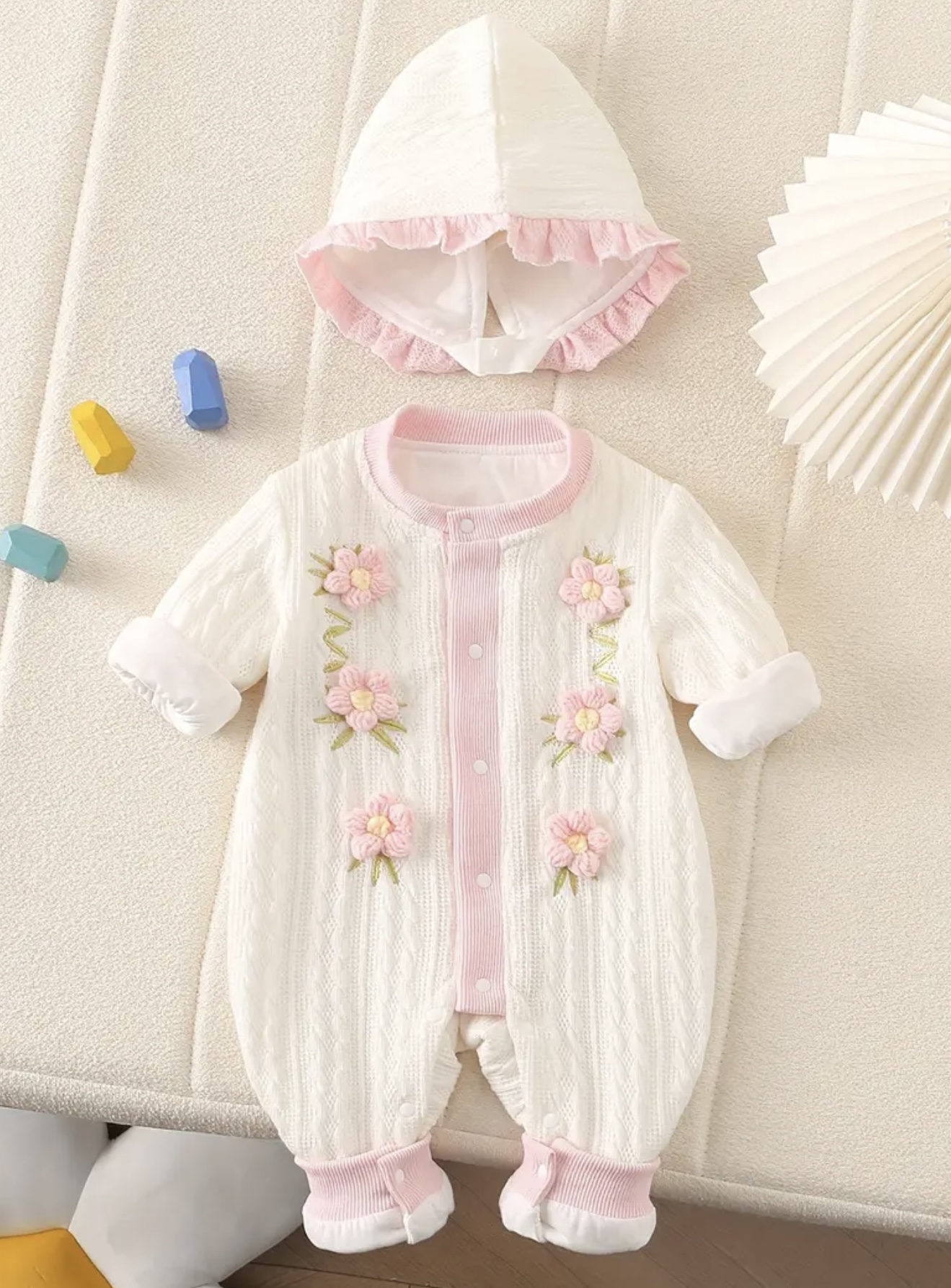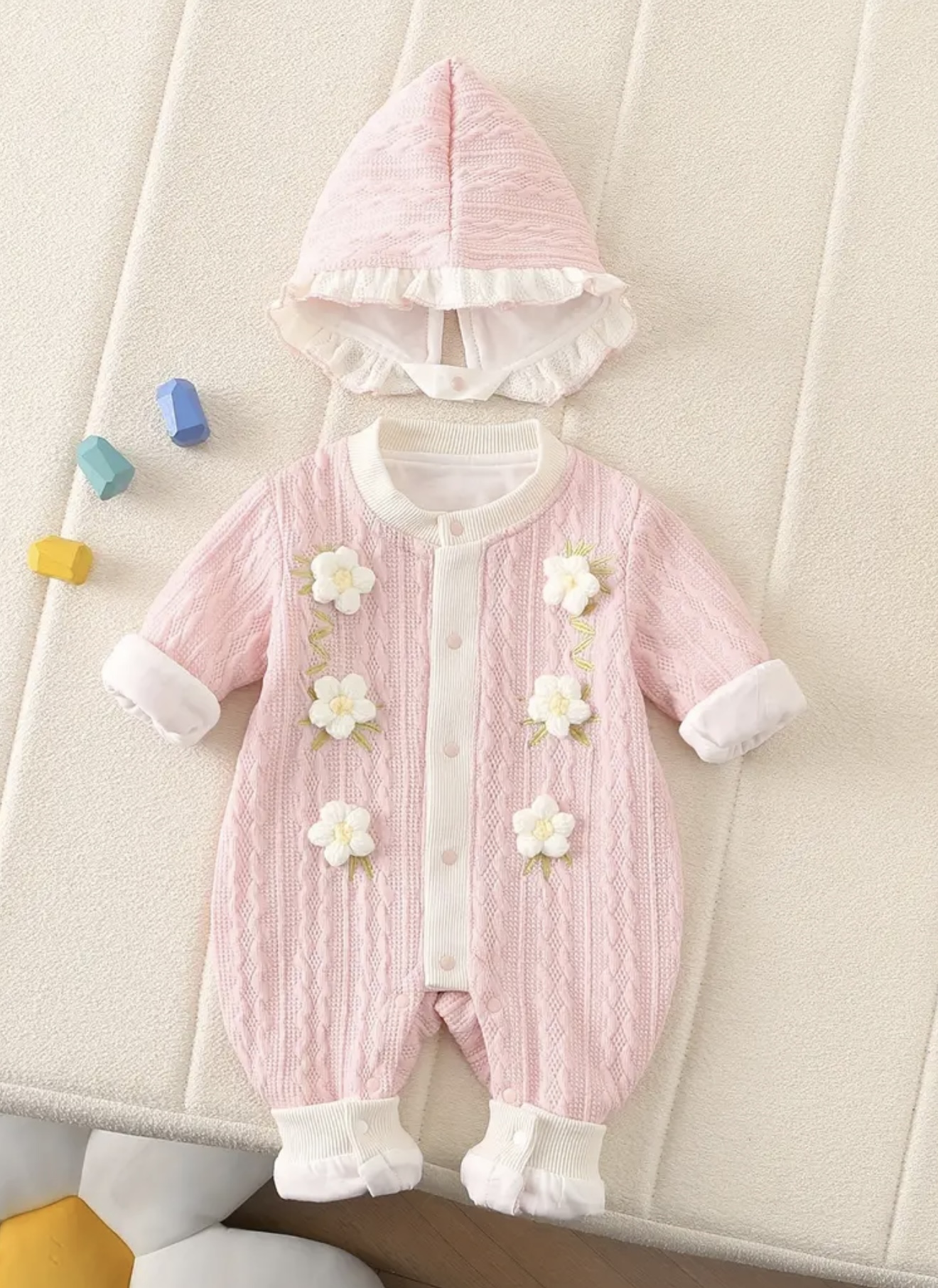 شامل سرهمی رومپر با طرح شش گل کوچک و کلاه گیپور، با سبک  بامزه. مناسب برای بهار و پاییز و استفاده در فضای باز.