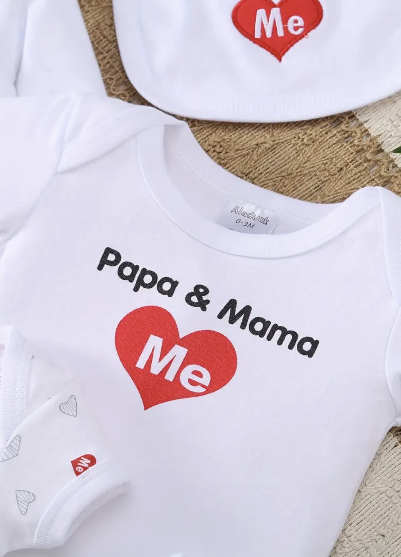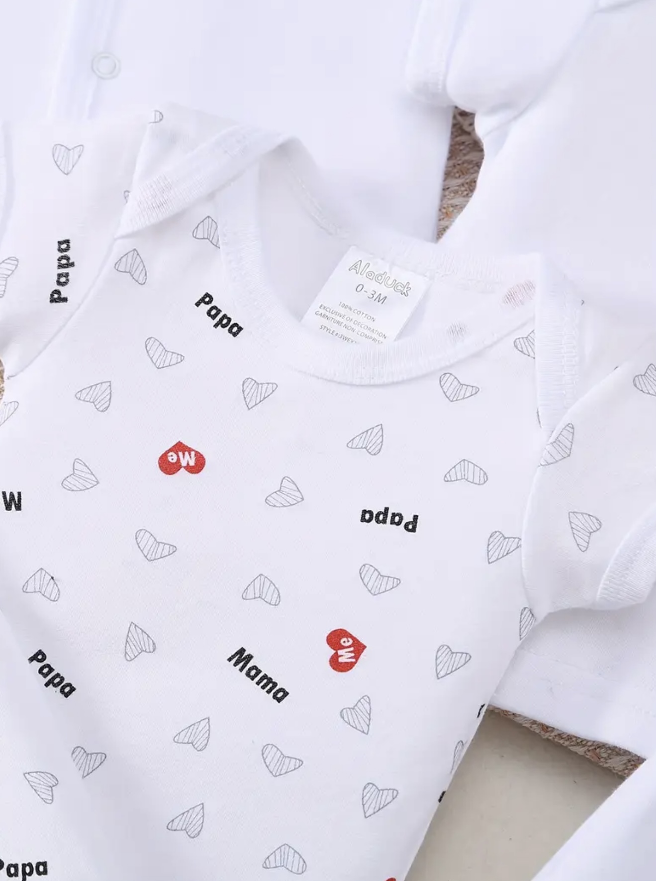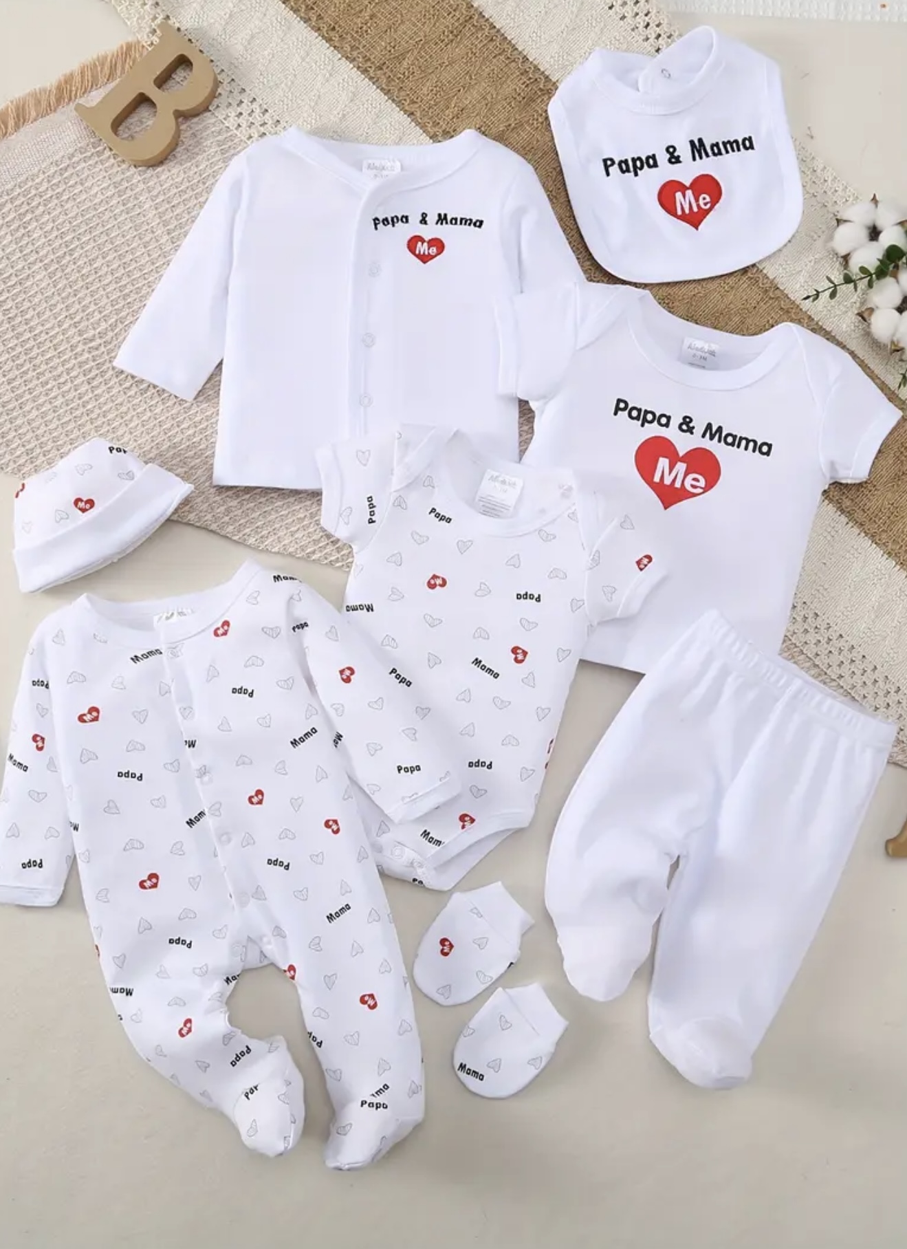 ست راحت و نرم بهاری و تابستانی برای نوزادان پسر و دختر، با طرح حروف قلبی هلو و الگوهای گلدار، شامل شلوار بلند، کلاه، پیشبند، جوراب، شلوار، ژاکت و بالاپوش، مناسب برای استفاده در فضای باز