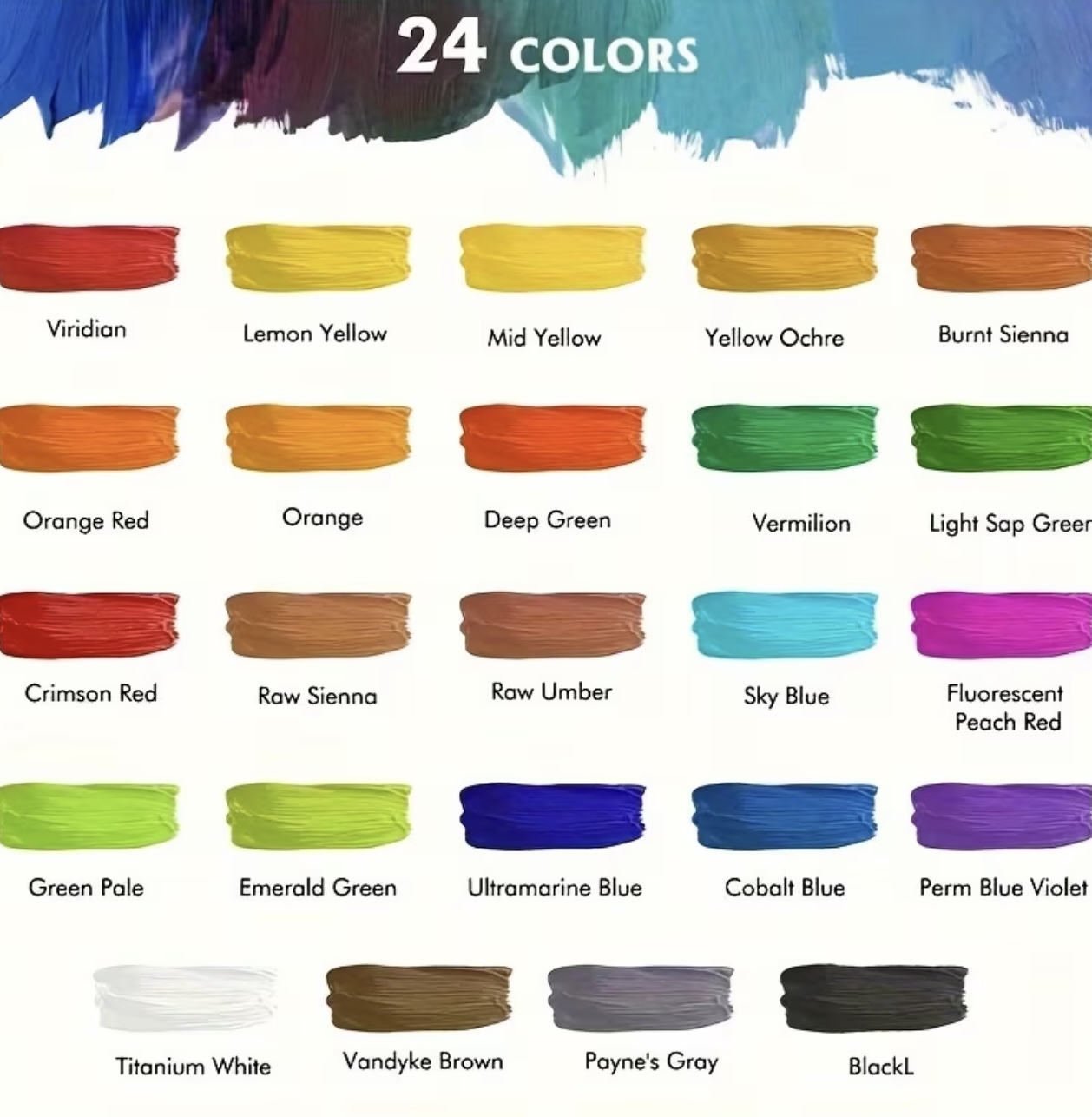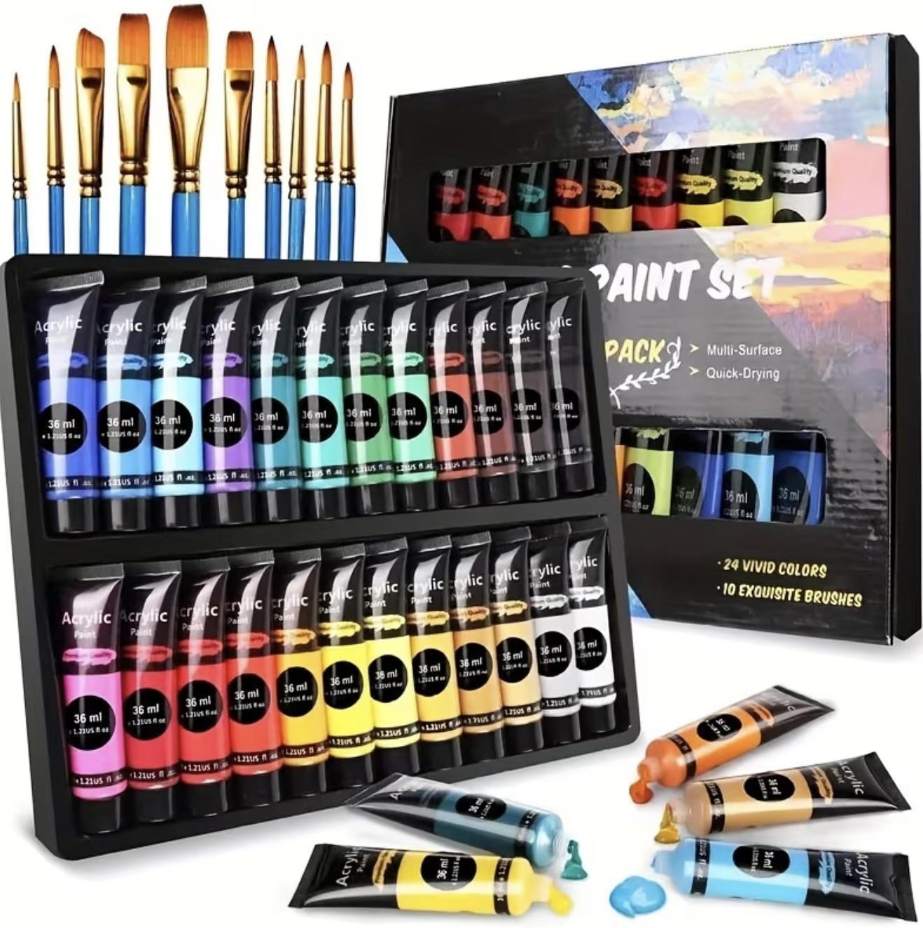 ست رنگ آکریلیک ۲۴ رنگ، شامل ۱۰ قلممو، هر بطری ۳۶ میلیلیتر، رنگهای قابل ترکیب، ایدهآل نقاشی روی کاغذ، سنگ، چوب، سرامیک و کاردستی