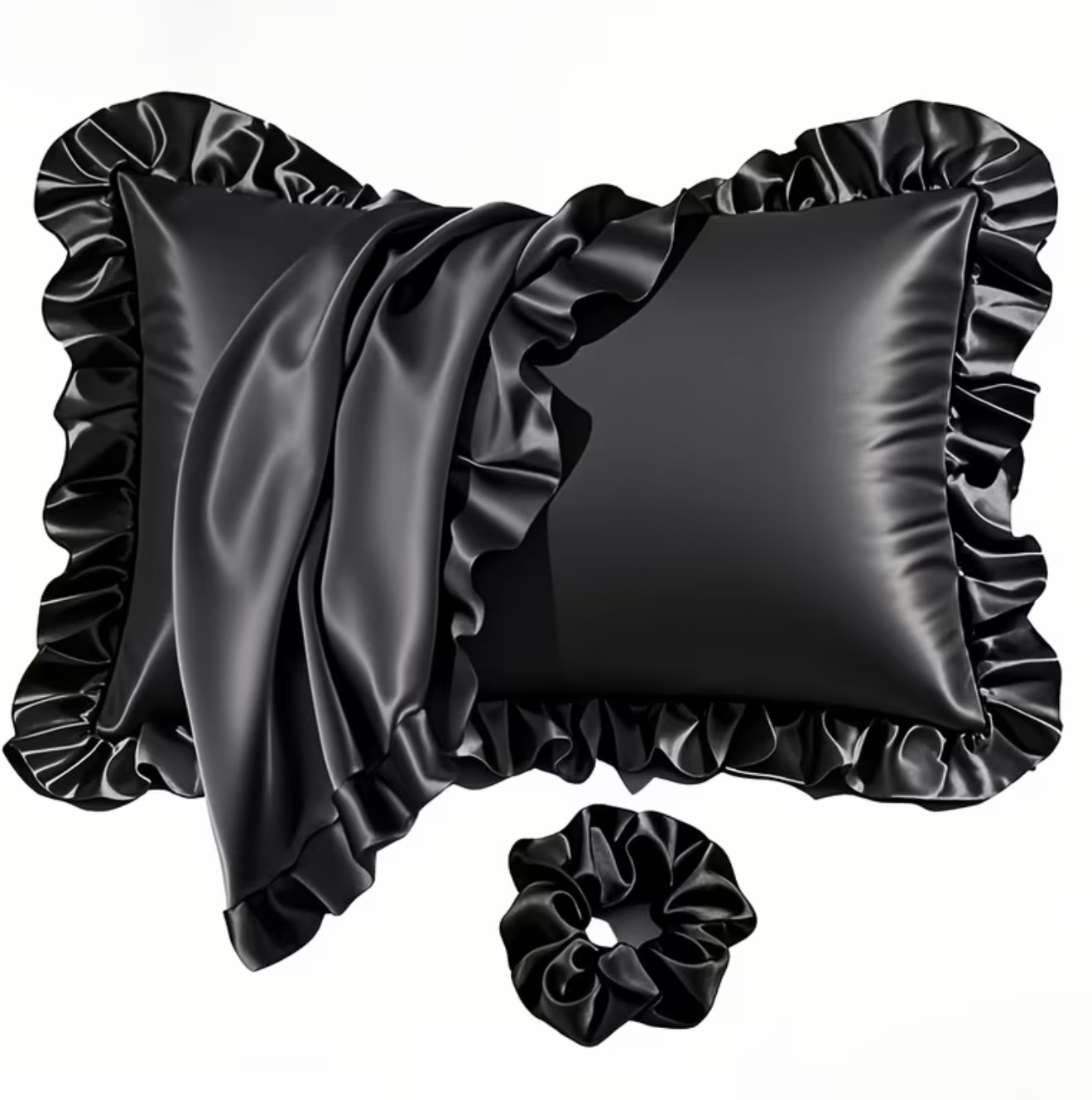 ست روبالشی دو تکه: ۱ عدد روبالشی ساتن چین‌دار (با جیب پاکتی، بدون بالش) + ۱ عدد کش مو، هم‌رنگ