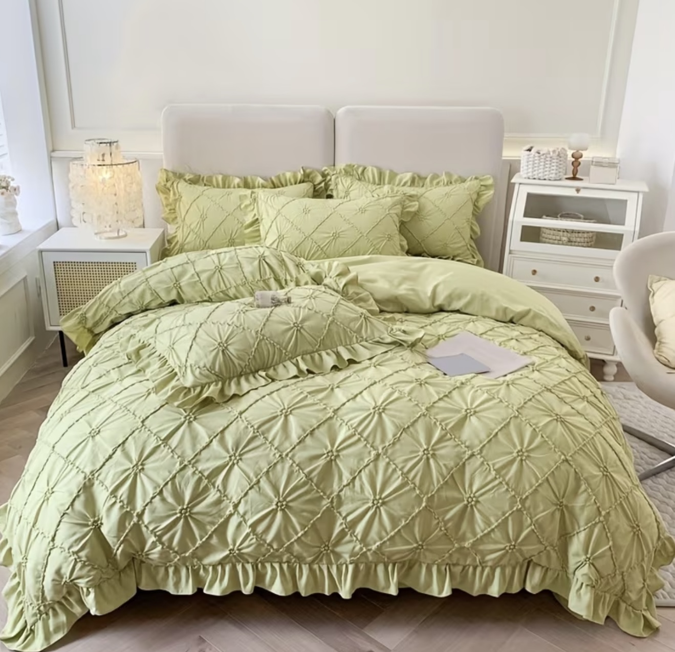 ست روتختی ۴ تکه به سبک کرهای با گلدوزی گل سهبعدی و توری لبه برگ نیلوفری،شامل ۱ عدد کاور لحاف، ۲ عدد روبالشی و ۱ عدد ملحفه ساده،