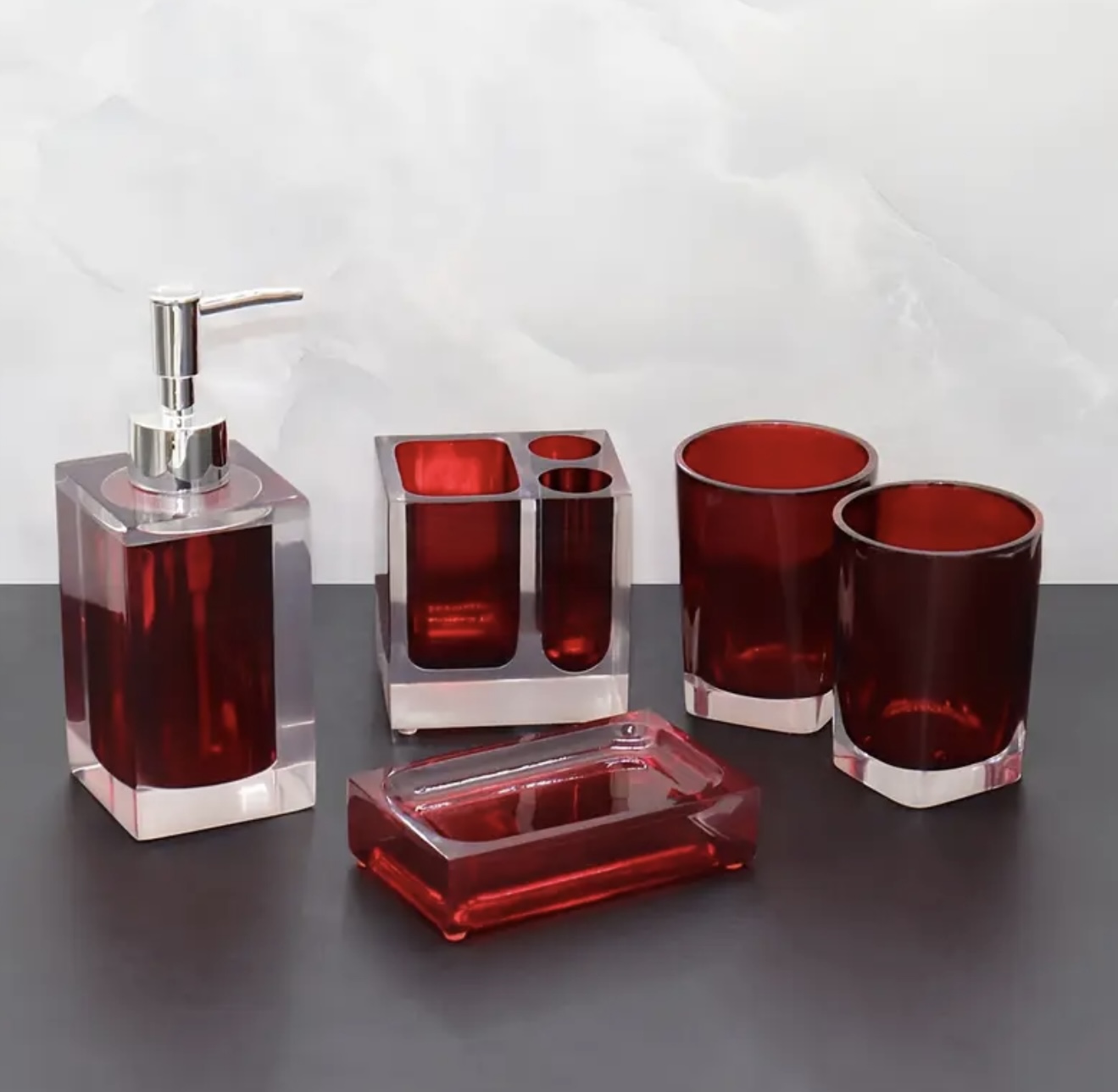 شامل پمپ مایع لوسیون، جای مسواک، لیوان‌ها و جا صابونی