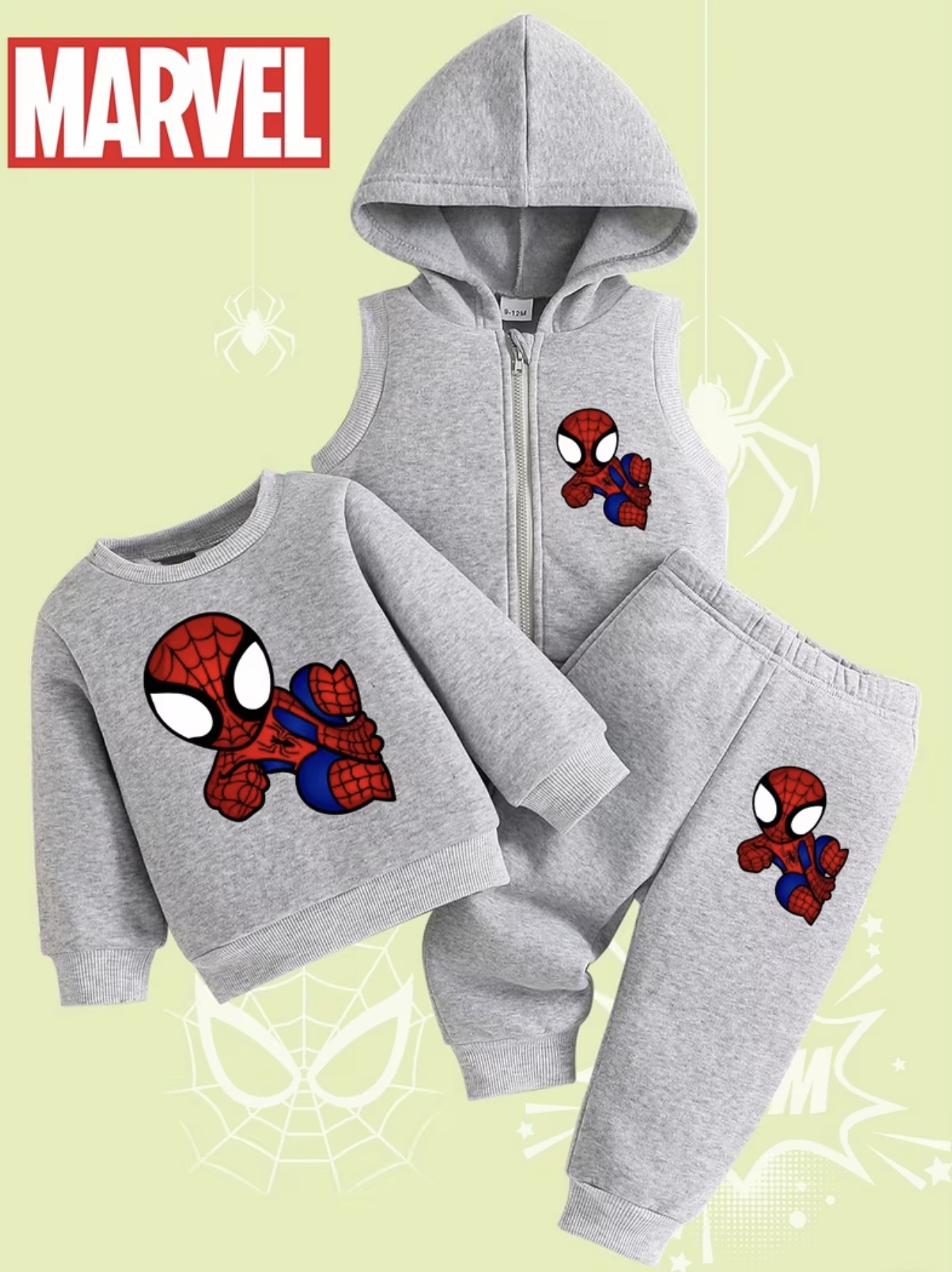 ست سه‌تکه بچگانه مارول اسپایدرمن شامل جلیقه بدون آستین کلاه‌دار با چاپ خفن و شیک طراحی گرم، راحت و کژوال