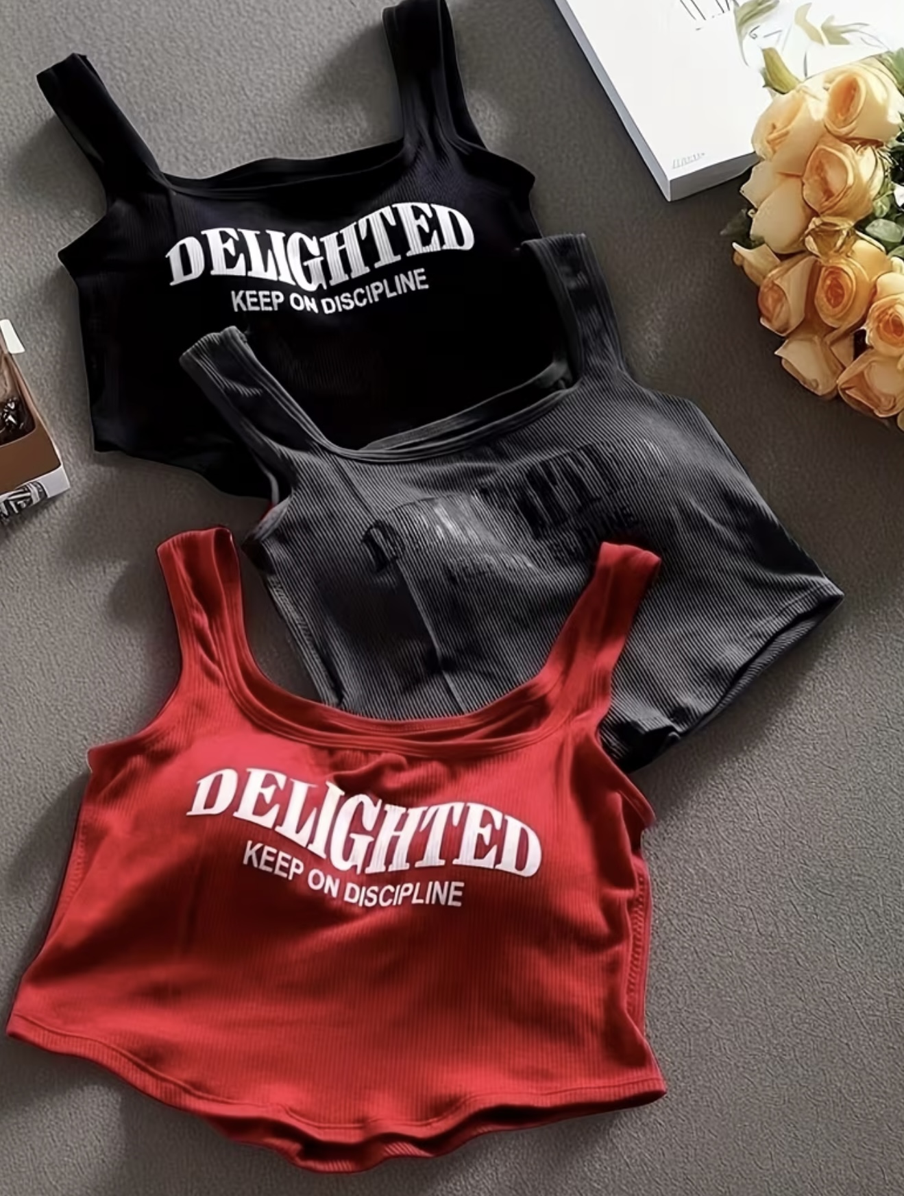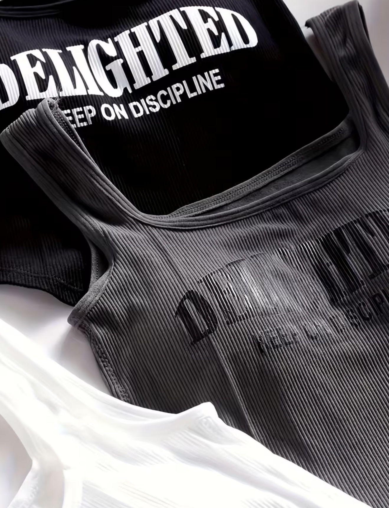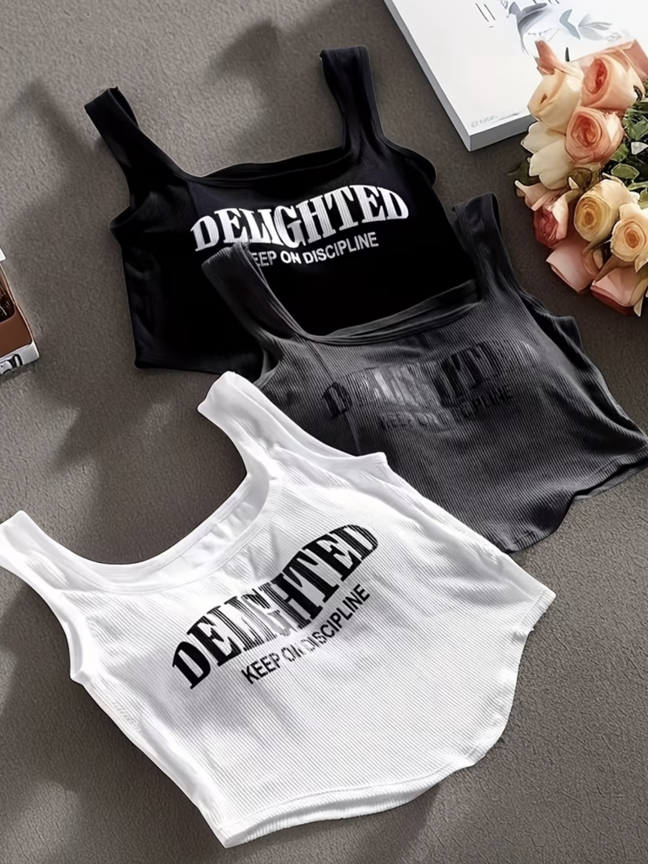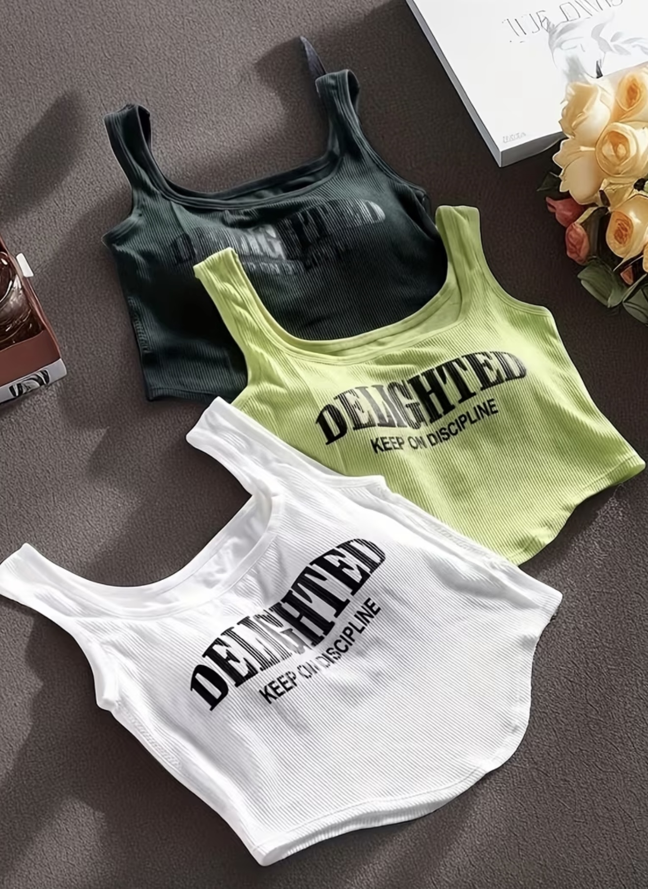 ست سه عددی تاپ زنانه بافتنی کژوال بدون آستین، دارای پد داخلی ثابت (غیرقابلجدا شدن)، یقه گرد، کشسانی متوسط، با طرح حروف الفبا و جزئیات اپلیکه، مناسب سنین ۱۴ سال به بالا، فیت جذب، تاپ رکابی بافتن