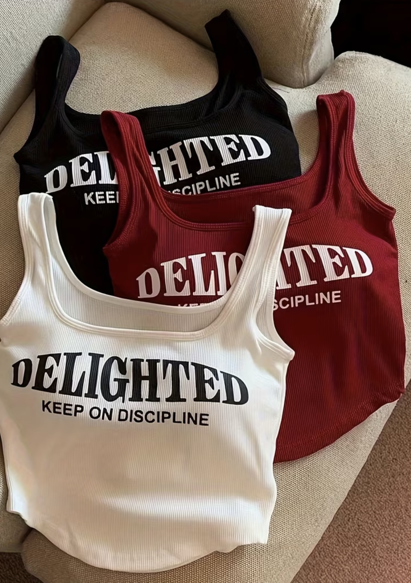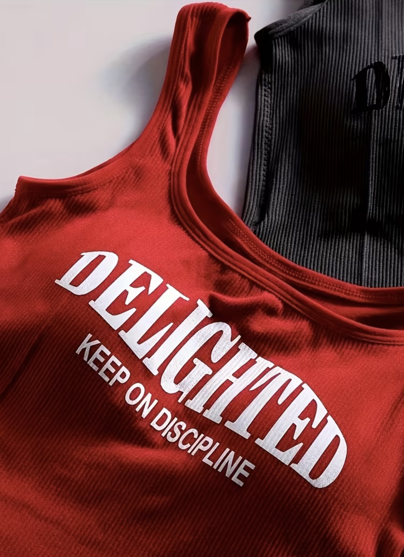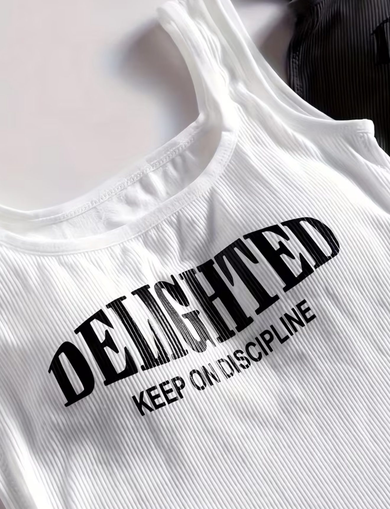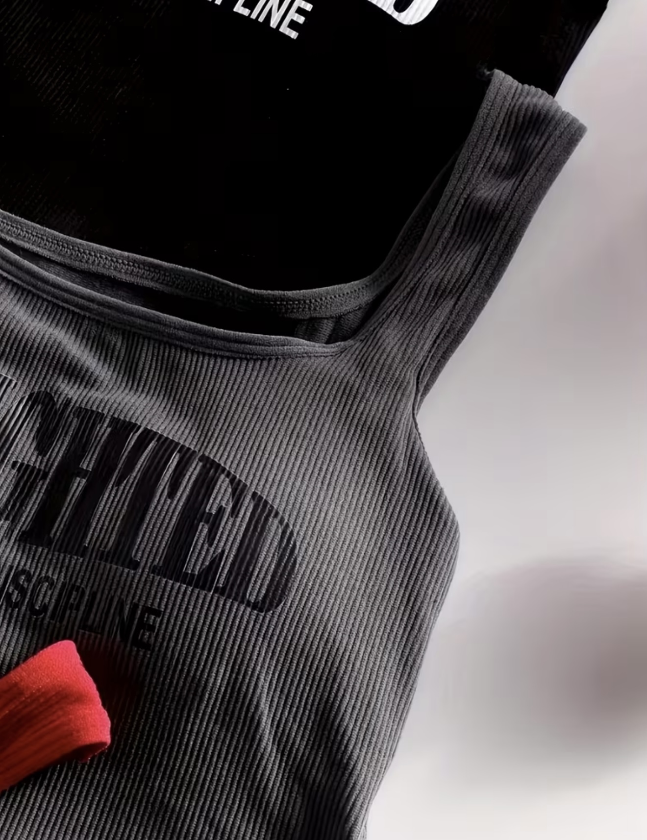 ست سه عددی تاپ زنانه بافتنی کژوال بدون آستین، دارای پد داخلی ثابت (غیرقابلجدا شدن)، یقه گرد، کشسانی متوسط، با طرح حروف الفبا و جزئیات اپلیکه، مناسب سنین ۱۴ سال به بالا، فیت جذب، تاپ رکابی بافتن