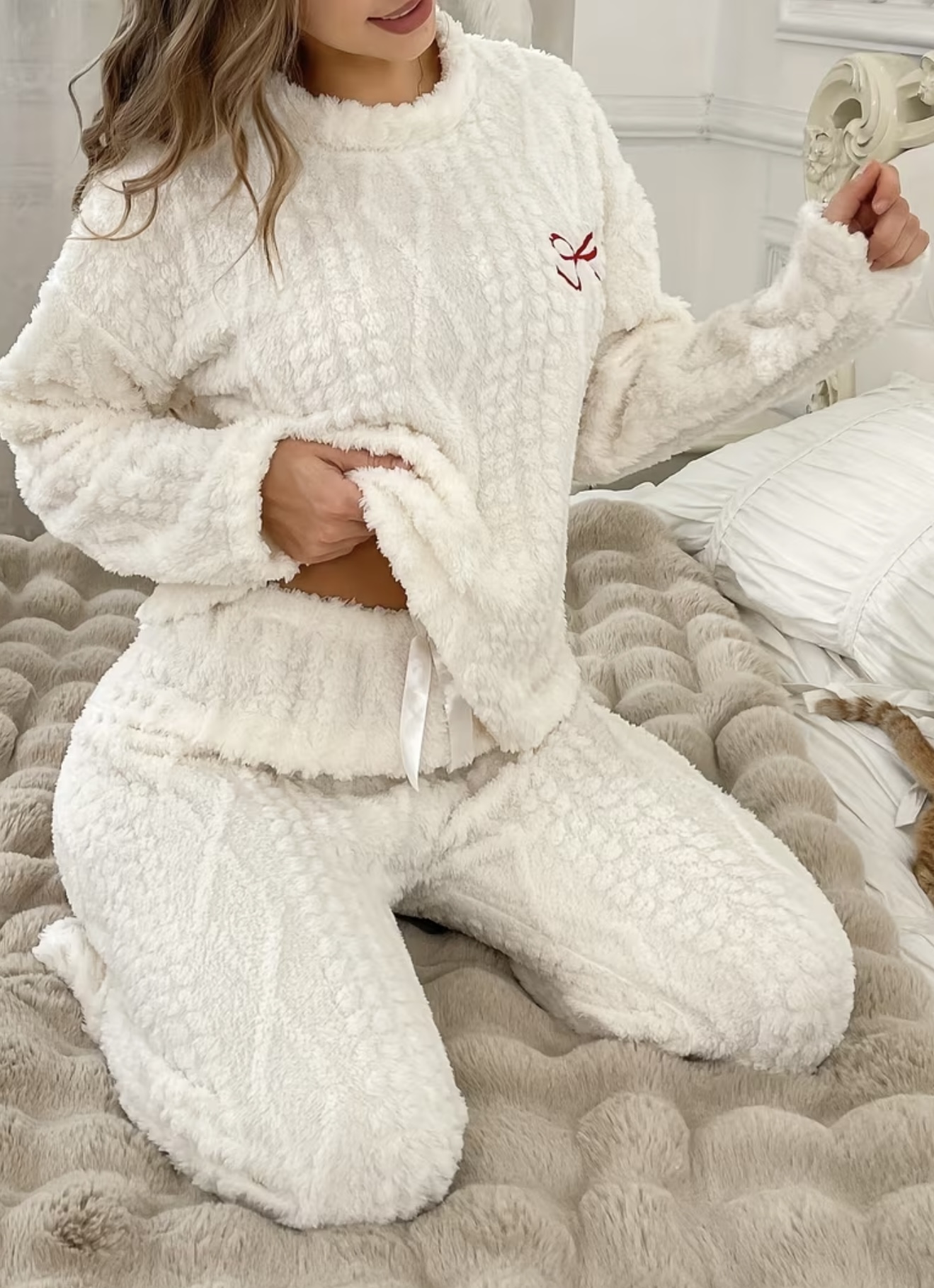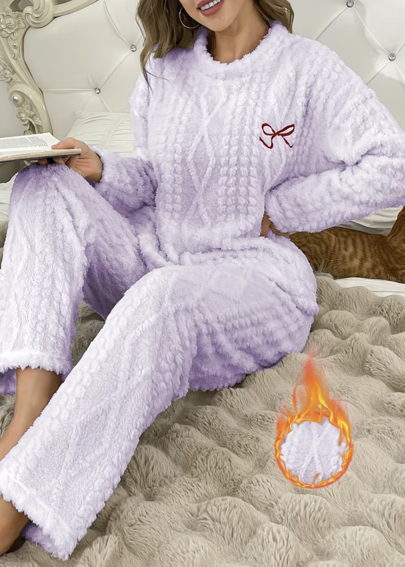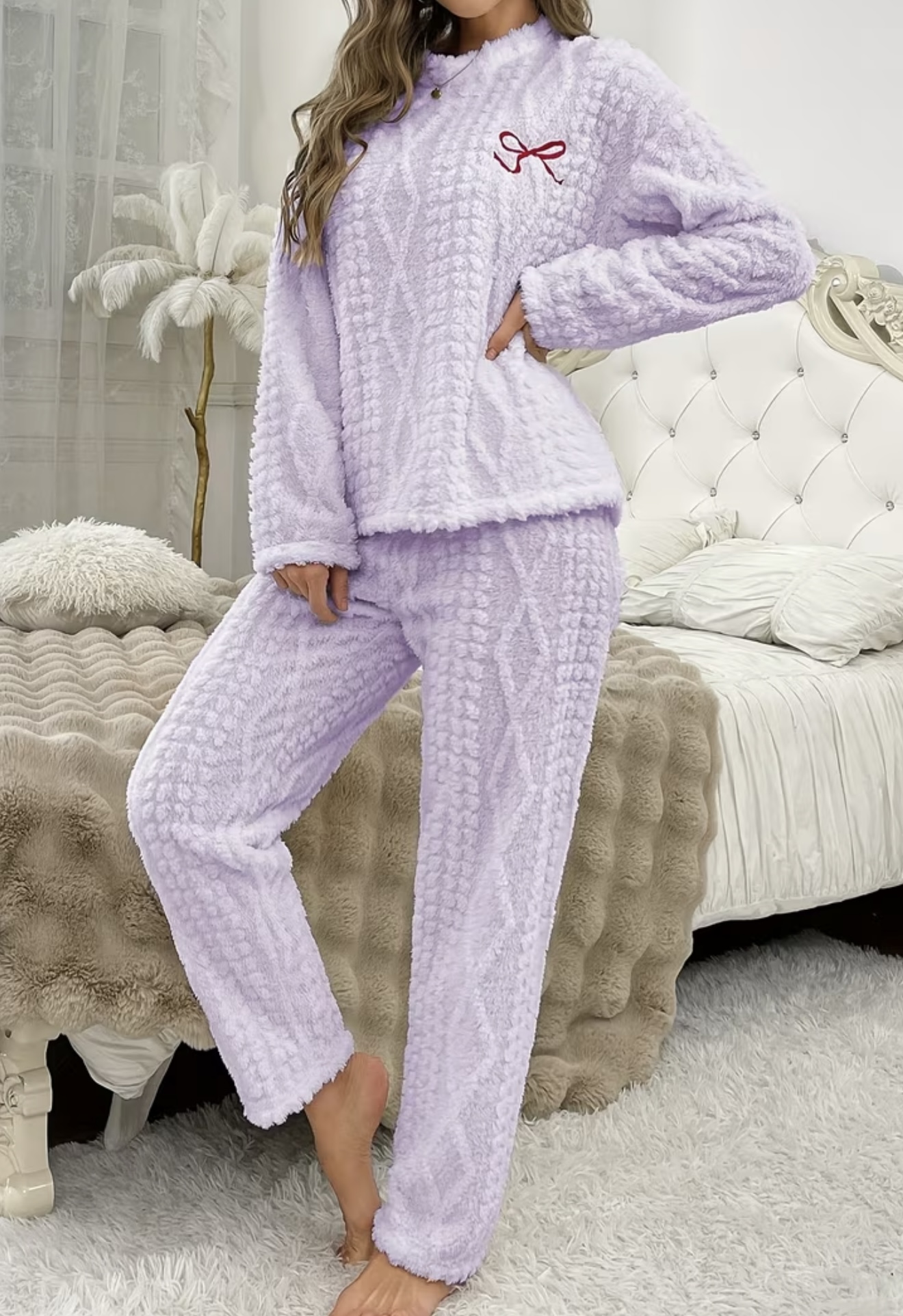 ست لباس راحتی زنانه پاییز و زمستان جدید، از جنس فلیس مرجانی، دارای گلدوزی پاپیون، گرم و جذاب، با آستین بلند و شلوار، لباس خانگی دوستداشتنی و راحای