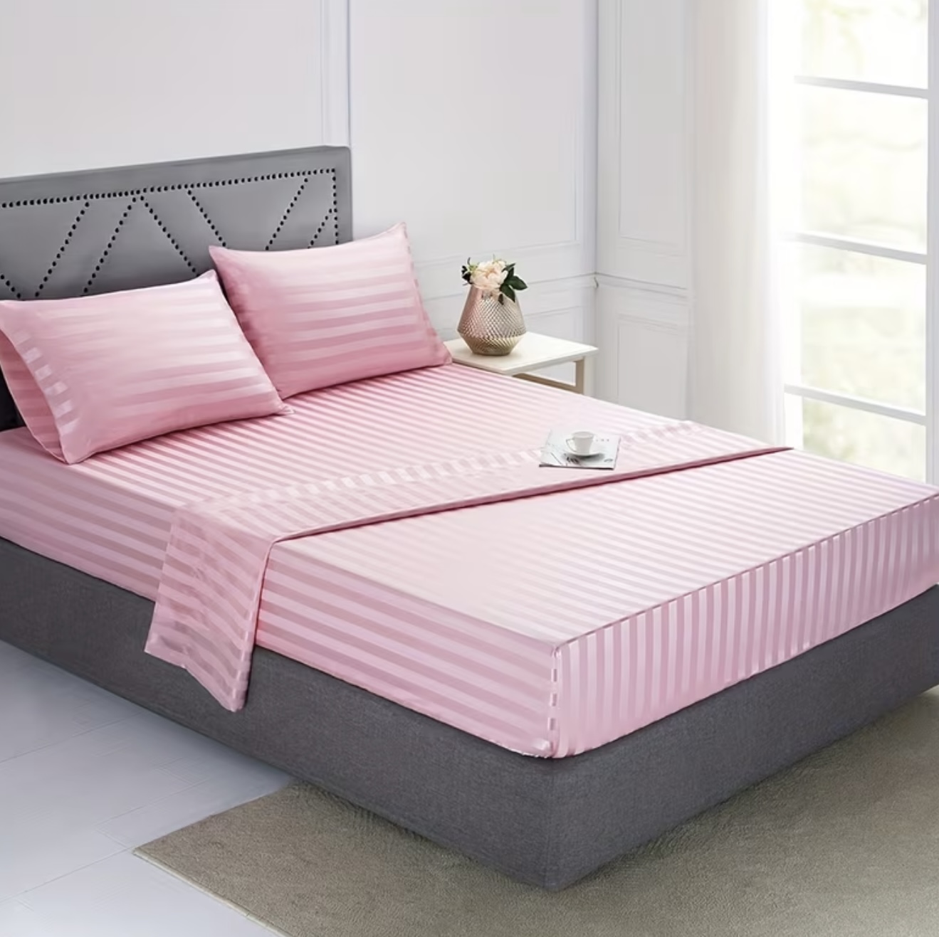 ست ملحفه ساتن راهراه ۳ یا ۴ تکه. شامل ۱ عدد ملحفه ساده، ۱ عدد ملحفه کشدار و ۱ یا ۲ عدد روبالشی (بدون بالش داخلی)