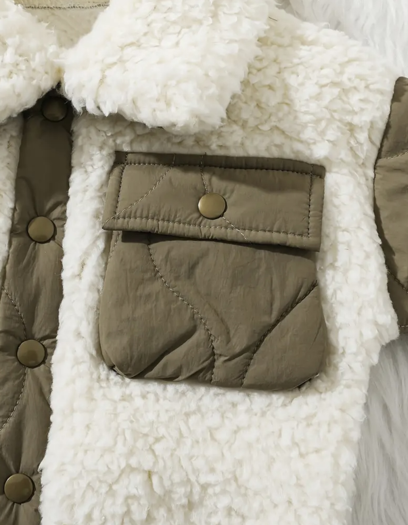 با طراحی پچورک مخملی، جیب کانتراست و یقه تزئینی. شیک، راحت و مناسب فصل سرما؛ انتخابی عالی برای عکاسی فضای باز نوزاد و استفاده روزمره در محیط بیرون