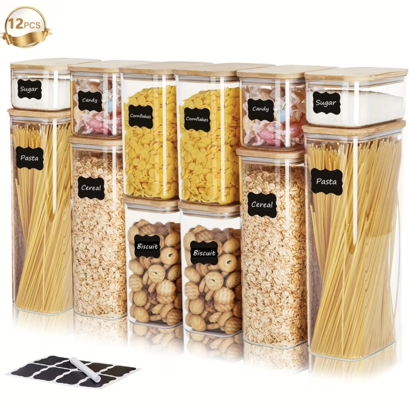 ست ۱۲ عددی ظروف نگهداری مواد غذایی – دارای درب بامبو و درزگیر هواگیر ساخته شده از جنس ایمن برای تماس با مواد غذایی، مناسب برای حفظ غلات، پاستا، شکر، قهوه، برنج و سایر مواد خوراکی حبوبات