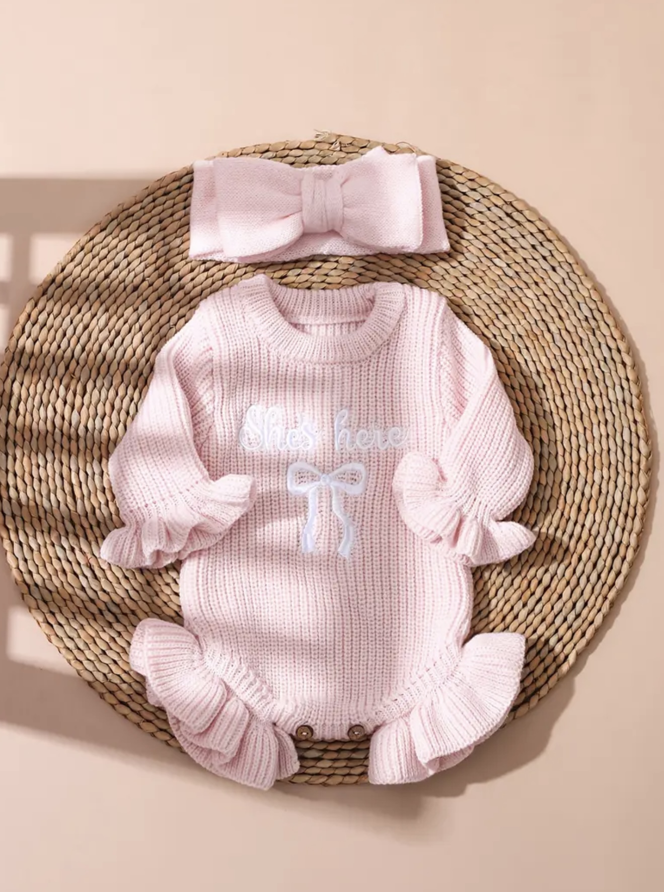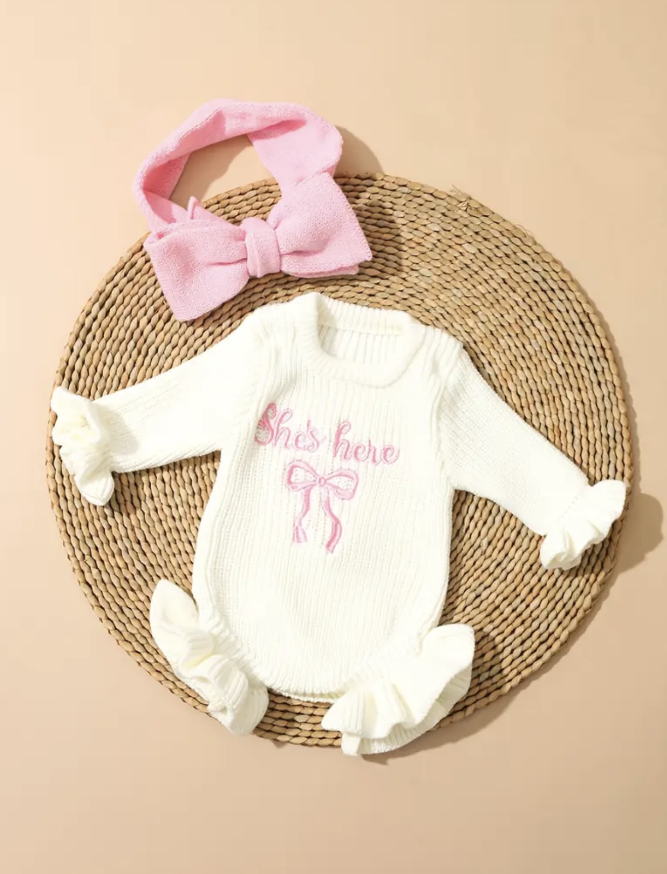 شامل سویشرت بافتنی آستین بلند به همراه هدبند پاپیونی. نرم و بامزه، مناسب برای فصل پاییز و زمستان.