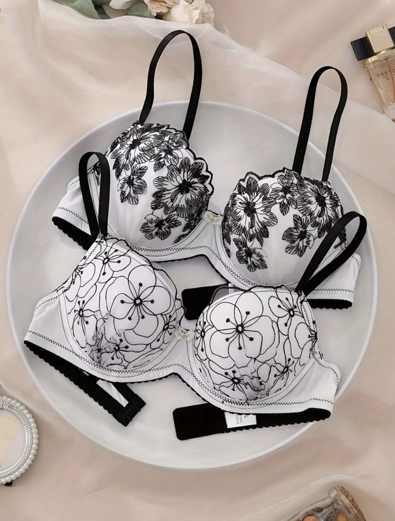ست ۲ عددی سوتین راحت و کلاسیک مشکی و سفید با دوخت گلدوزی، دارای فنر