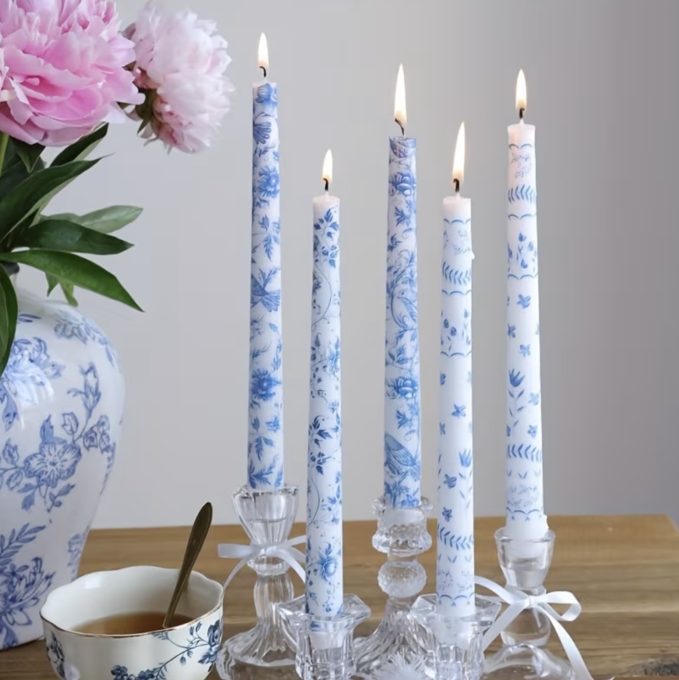 ست ۲ عددی شمع مخروطی شیک دستساز و نقاشی شده با طرح زیبای آبی و سفید روی پورسلین