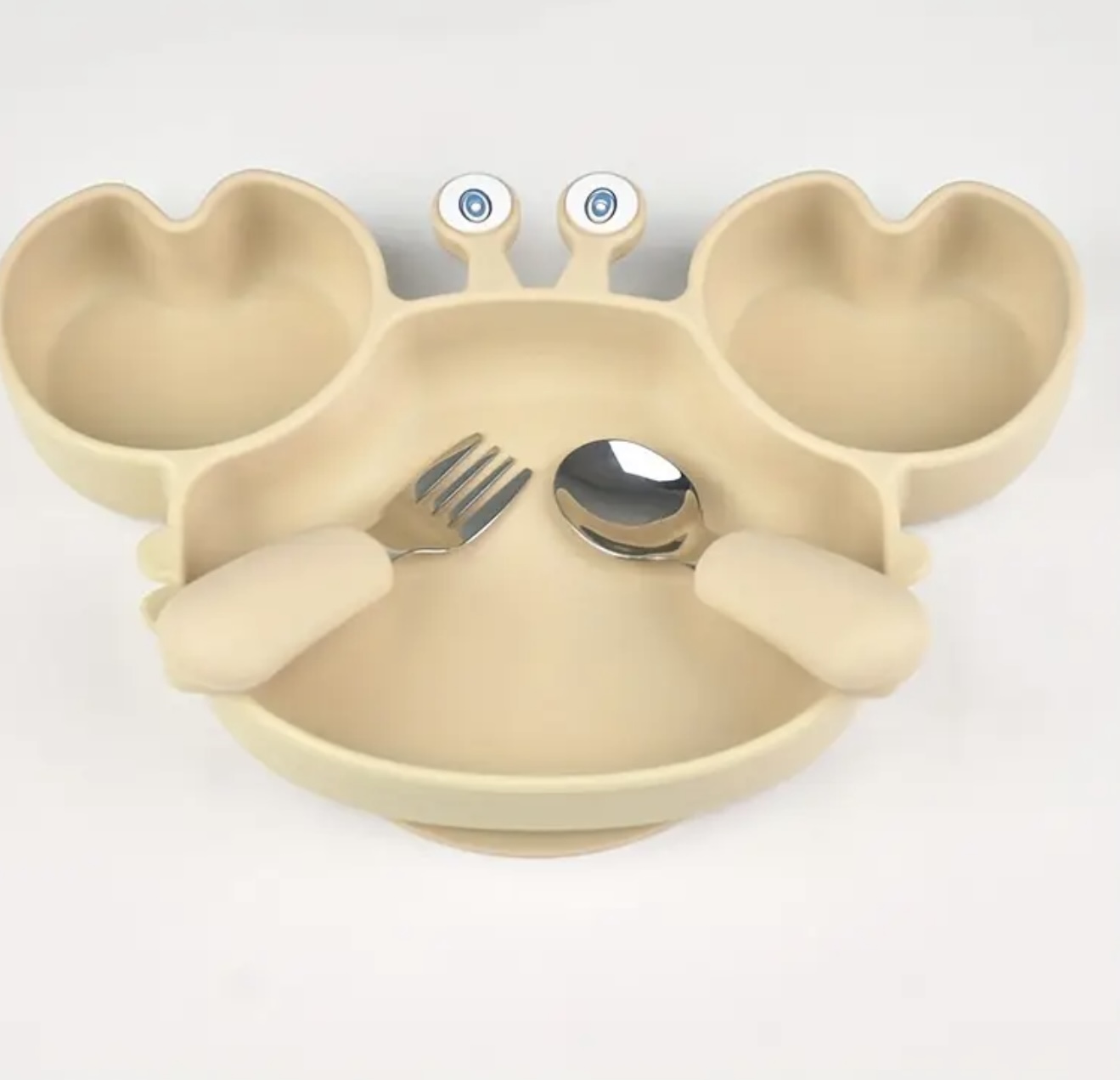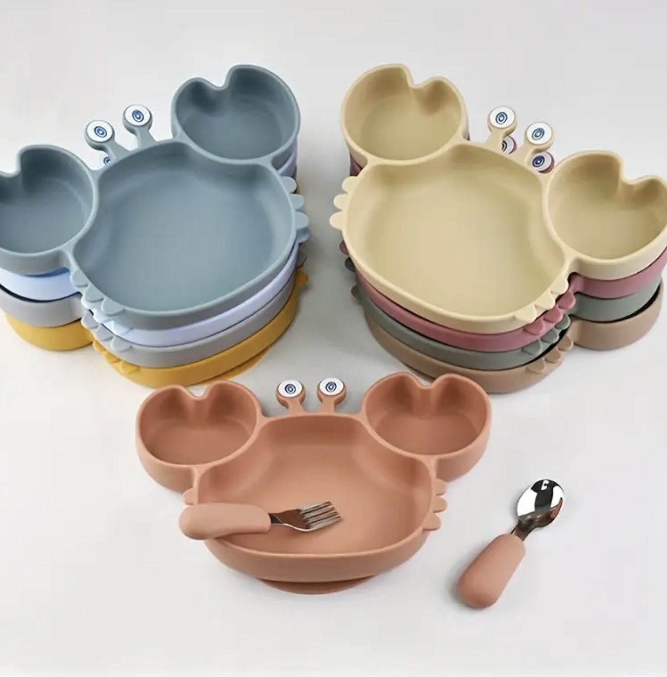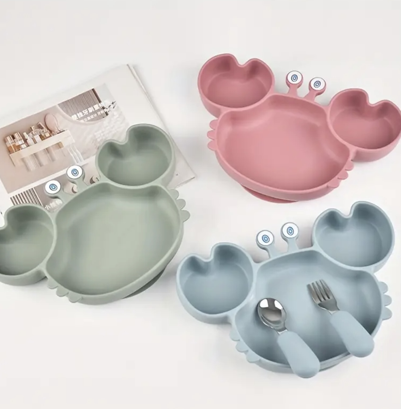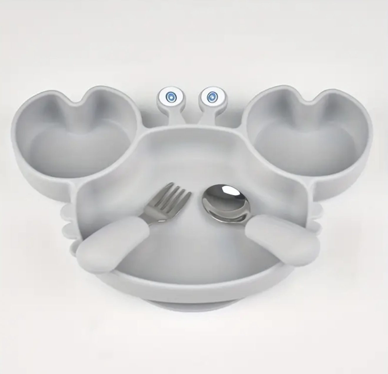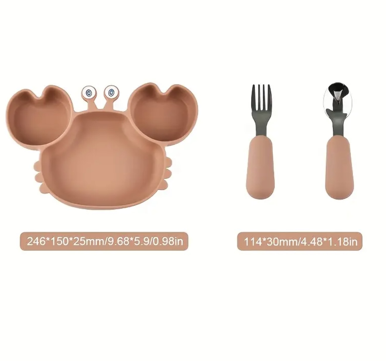 ست ۳ تکه ظروف غذاخوری کودک MT – شامل بشقاب تقسیم‌بندی‌شده ضدلغزش به‌همراه قاشق و چنگال استیل دسته‌کوتاه مخصوص آموزش غذا خوردن نوزاد و نوپا، تمیزشونده آسان، بدون BPA