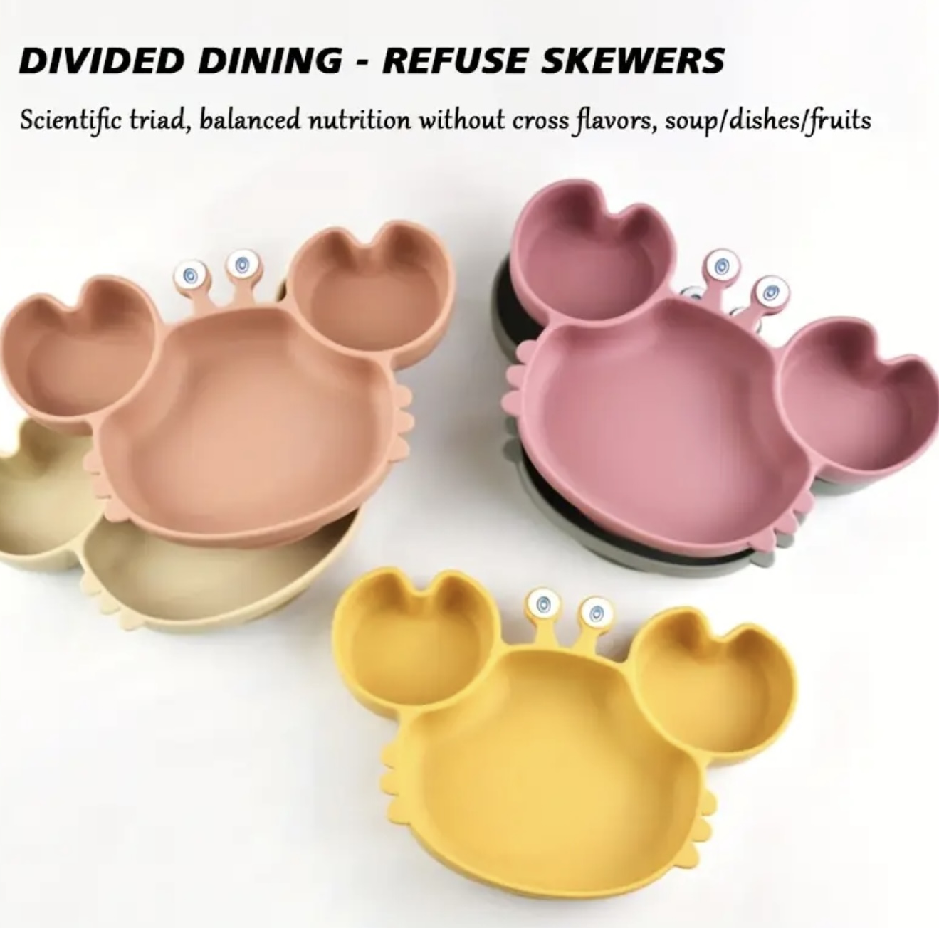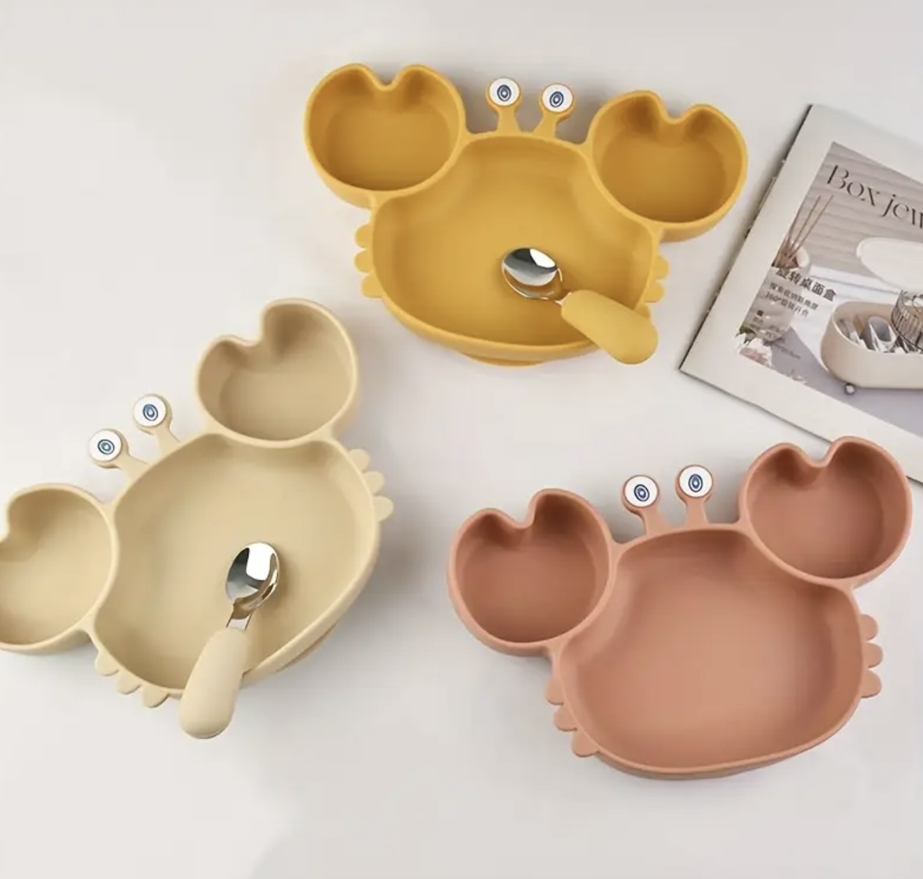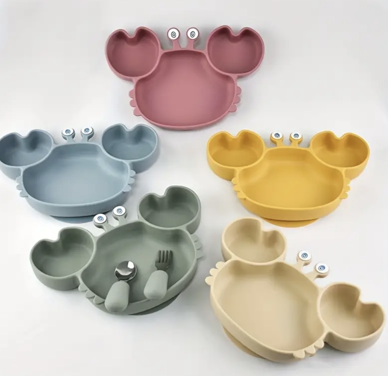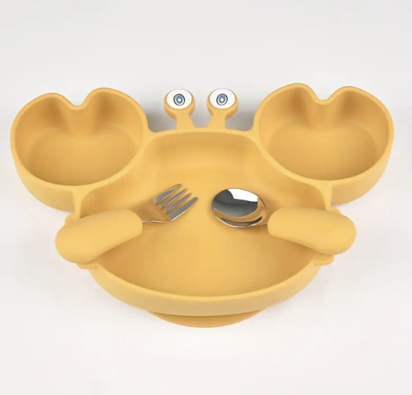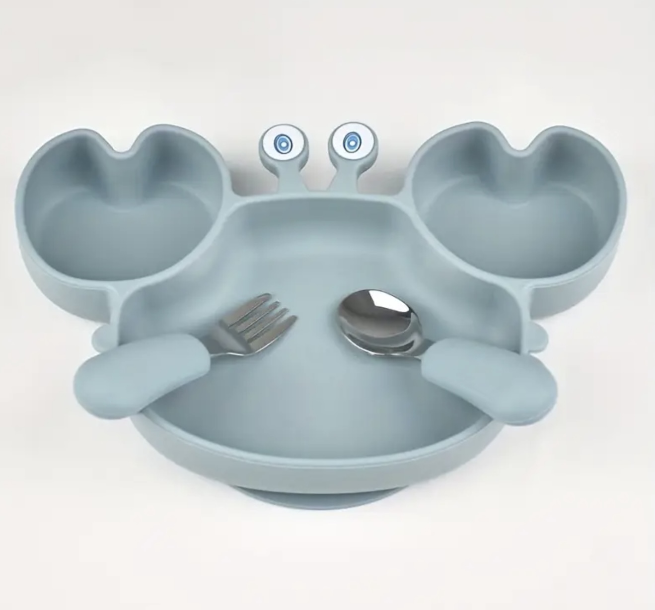 ست ۳ تکه ظروف غذاخوری کودک MT – شامل بشقاب تقسیم‌بندی‌شده ضدلغزش به‌همراه قاشق و چنگال استیل دسته‌کوتاه مخصوص آموزش غذا خوردن نوزاد و نوپا، تمیزشونده آسان، بدون BPA