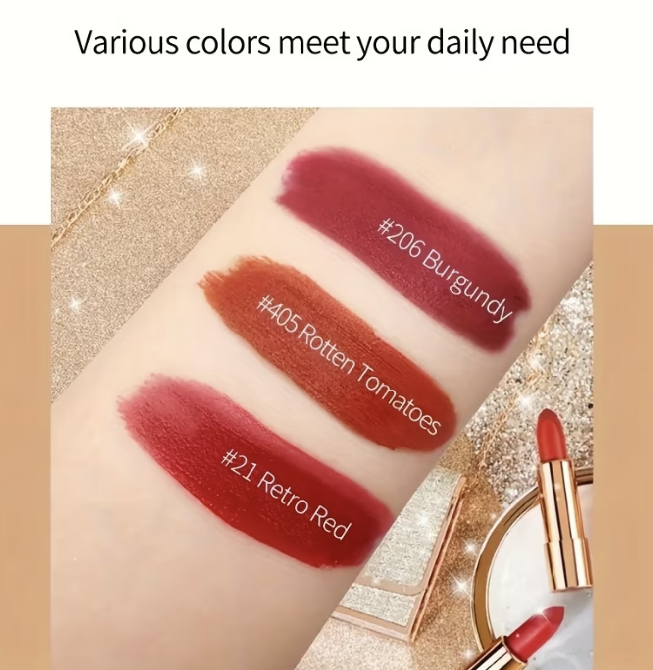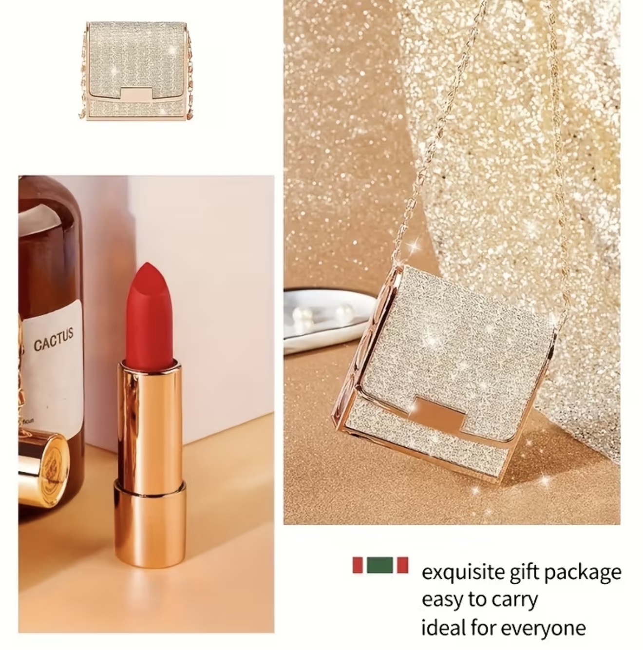 ست ۳ رنگ رژ لب با کیف چرمی دانتل‌دار و بند زنجیری نرم