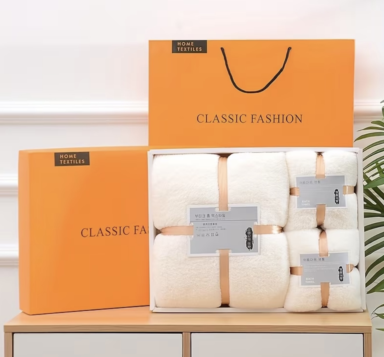 جنس ۱۰۰٪ پلی‌استر، وزن ۲۴۰ گرم در متر مربع، پارچه بافتنی، نرم و جذبی، همراه با جعبه هدیه با دستگیره، مناسب برای هدیه عروسی و دکوراسیون منزل، شامل دستمال شستشو