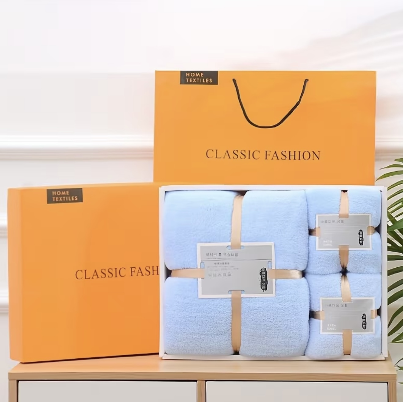 جنس ۱۰۰٪ پلی‌استر، وزن ۲۴۰ گرم در متر مربع، پارچه بافتنی، نرم و جذبی، همراه با جعبه هدیه با دستگیره، مناسب برای هدیه عروسی و دکوراسیون منزل، شامل دستمال شستشو