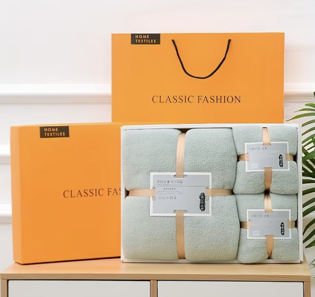 جنس ۱۰۰٪ پلیاستر، وزن ۲۴۰ گرم در متر مربع، پارچه بافتنی، نرم و جذبی، همراه با جعبه هدیه با دستگیره، مناسب برای هدیه عروسی و دکوراسیون منزل، شامل دستمال شستشو