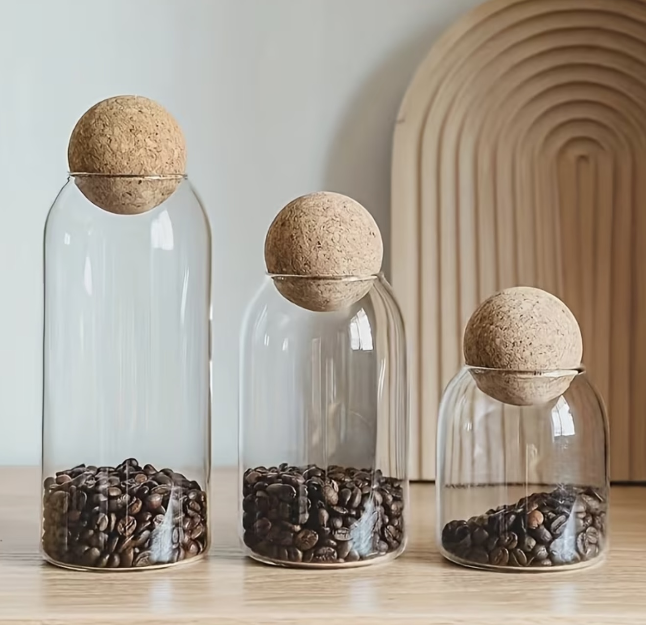 ست ۳ عددی مینیمال شیشه بوروسیلیکات با درب چوب پنبهای و توپک چوبی – مناسب برای نگهداری ادویهها، قهوه، حبوبات و سایر مواد خوراکی