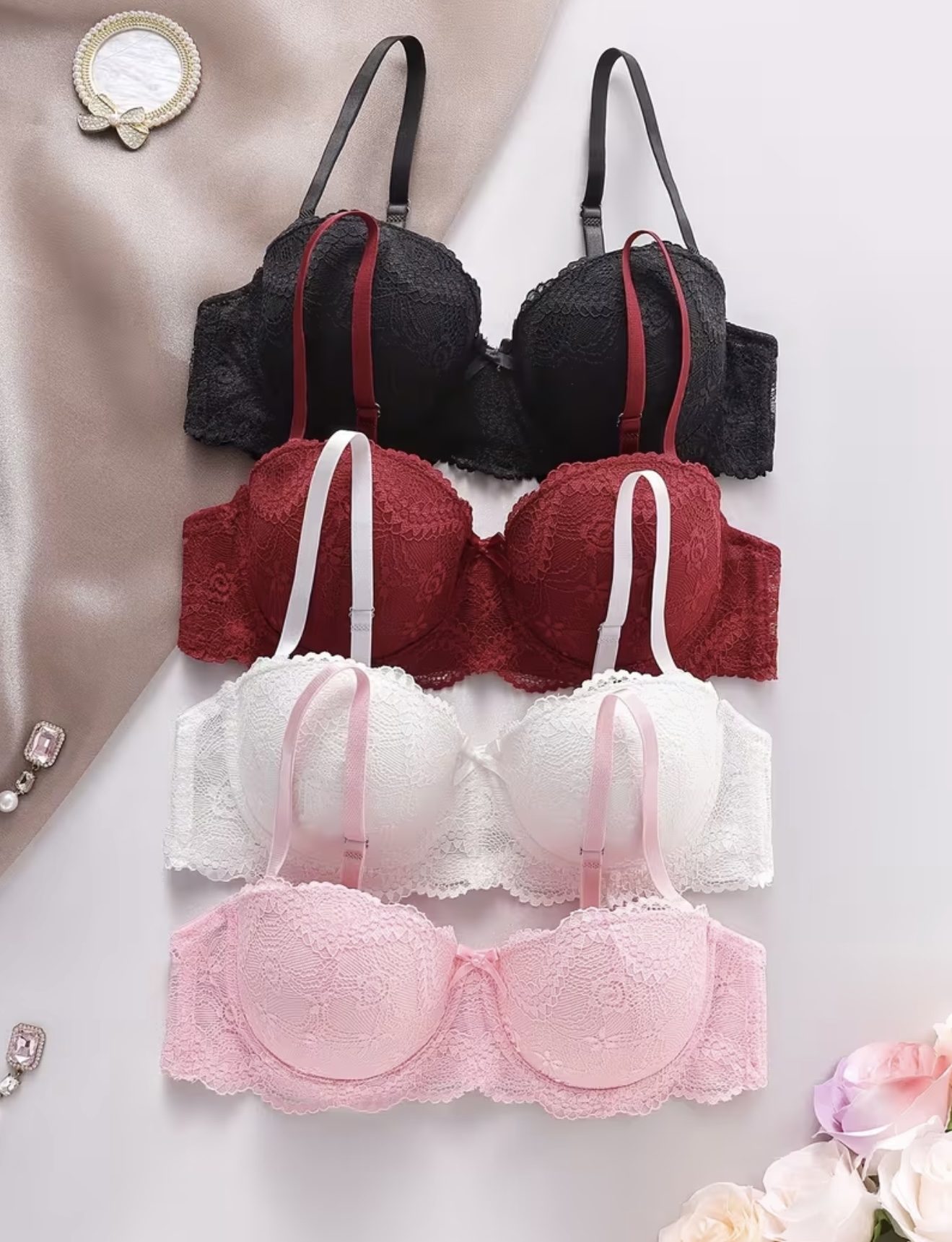ست ۴ تکه سوتین زنانه با توری و فنر فلزی، سوتین بالا با کاپهای نازک جمعکننده