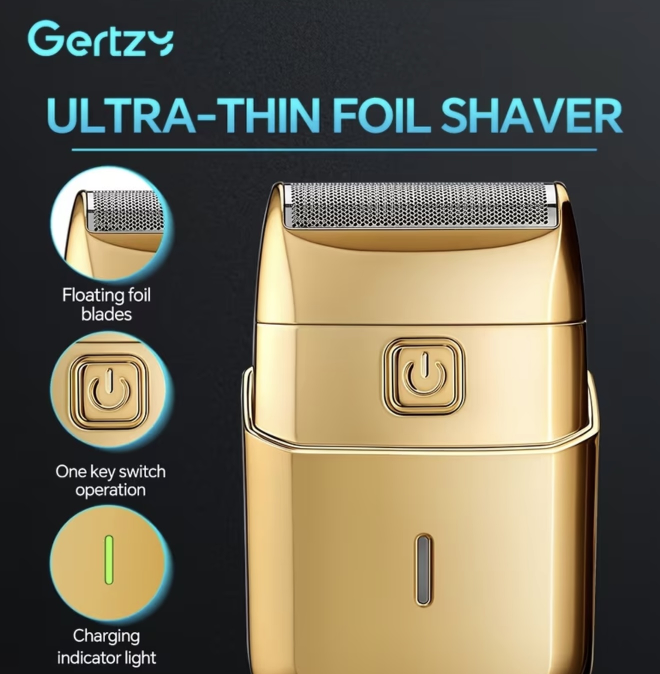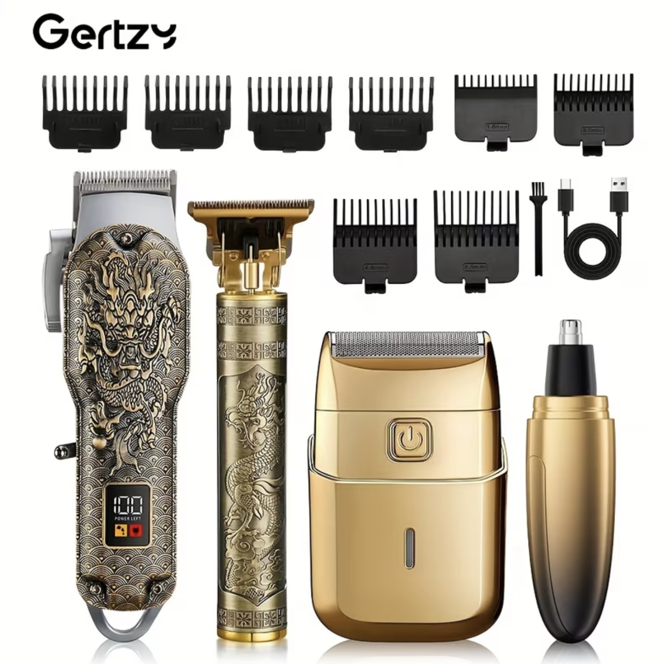 ست ۴ در ۱ ماشین اصلاح حرفهای مردانه قابل شارژ: شامل ماشین اصلاح مو، ریشتراش فویلی، ماشین اصلاح دقیق و موزن بینی – ست طلایی ۴ تکه، مناسب استفاده در خانه و آرایشگاه، شامل شانه محدودکننده