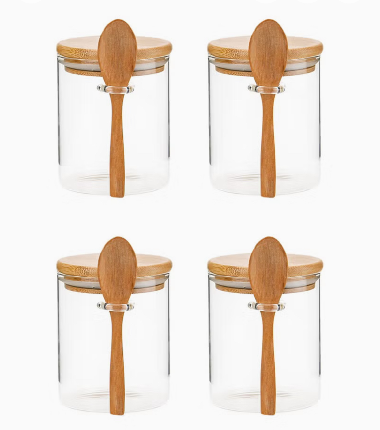 ست ۴ عددی شیشه بوروسیلیکات ۵۰۰ میلیلیتری با درب بامبو هوابند و قاشق، بدون، مناسب برای نگهداری غذا، قهوه، چای، ادویه و دسرها،مربا