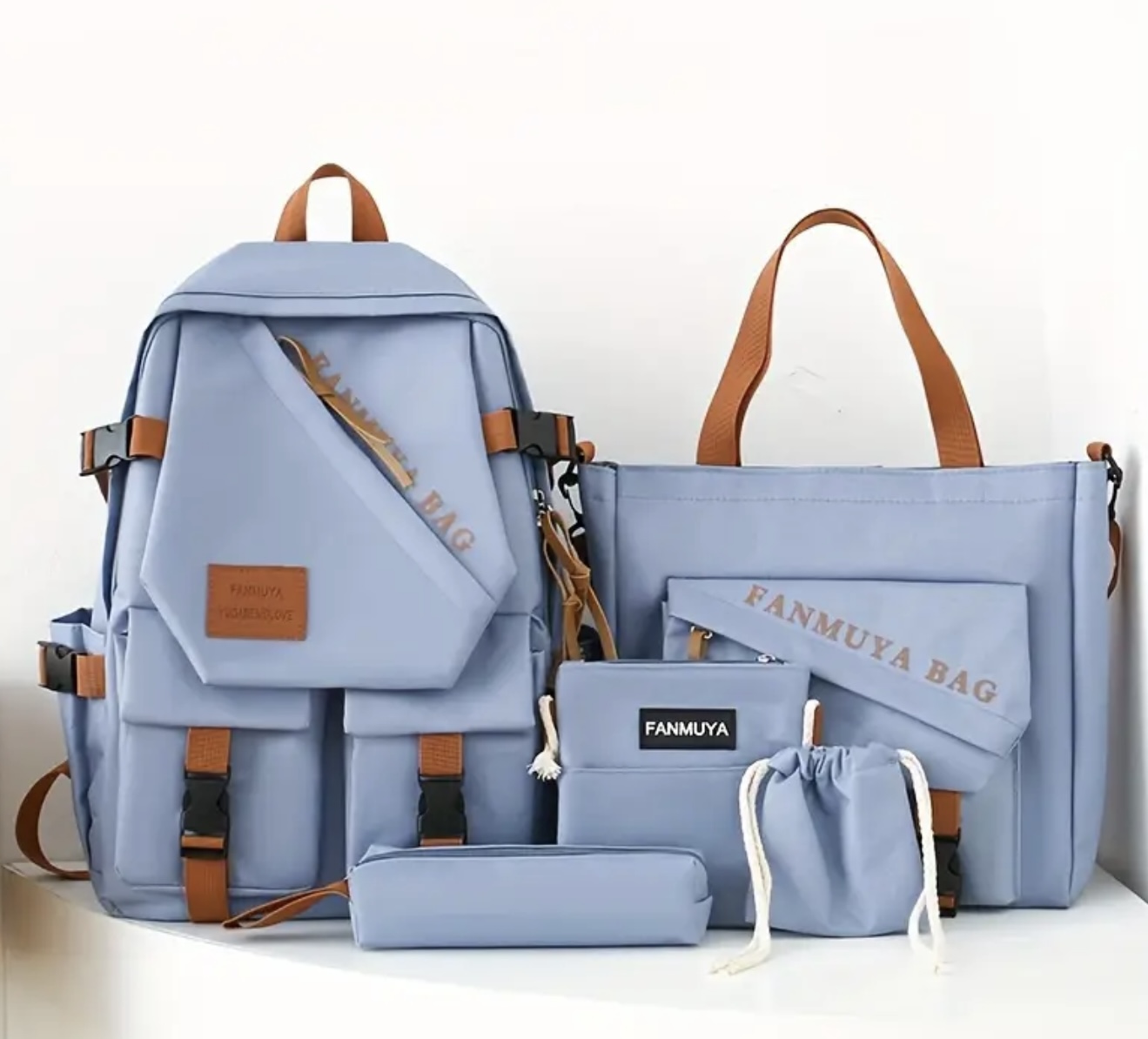 ست ۵ تکه کوله‌پشتی گرافیکی با طرح حروف – یک ست استایل پریپی و زیباشناسانه شامل کوله‌پشتی روزمره، کیف دستی (توت‌بگ)، کیف دوشی، کیف بندکشی و جامدادی، مناسب مدرسه و سفر