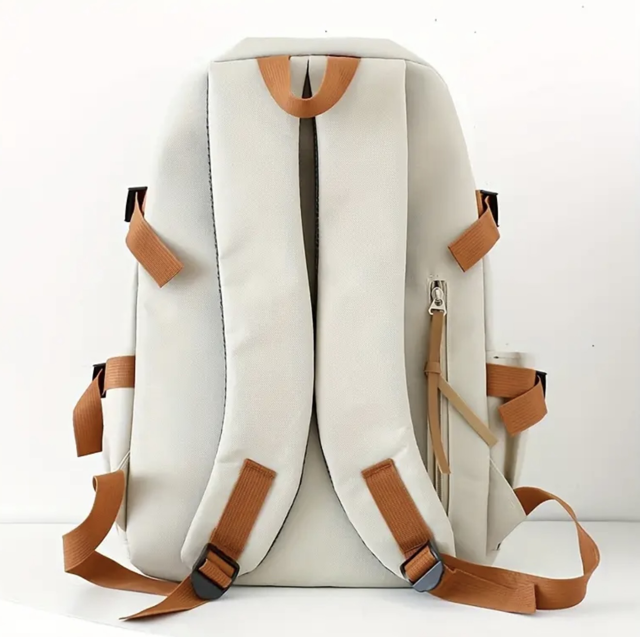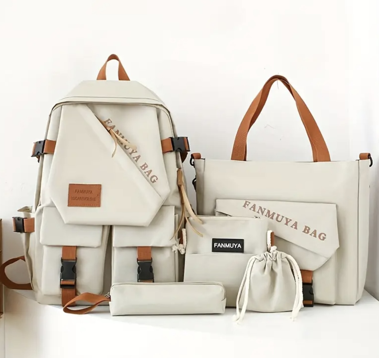 ست ۵ تکه کولهپشتی گرافیکی با طرح حروف – یک ست استایل پریپی و زیباشناسانه شامل کولهپشتی روزمره، کیف دستی (توتبگ)، کیف دوشی، کیف بندکشی و جامدادی، مناسب مدرسه و سفر