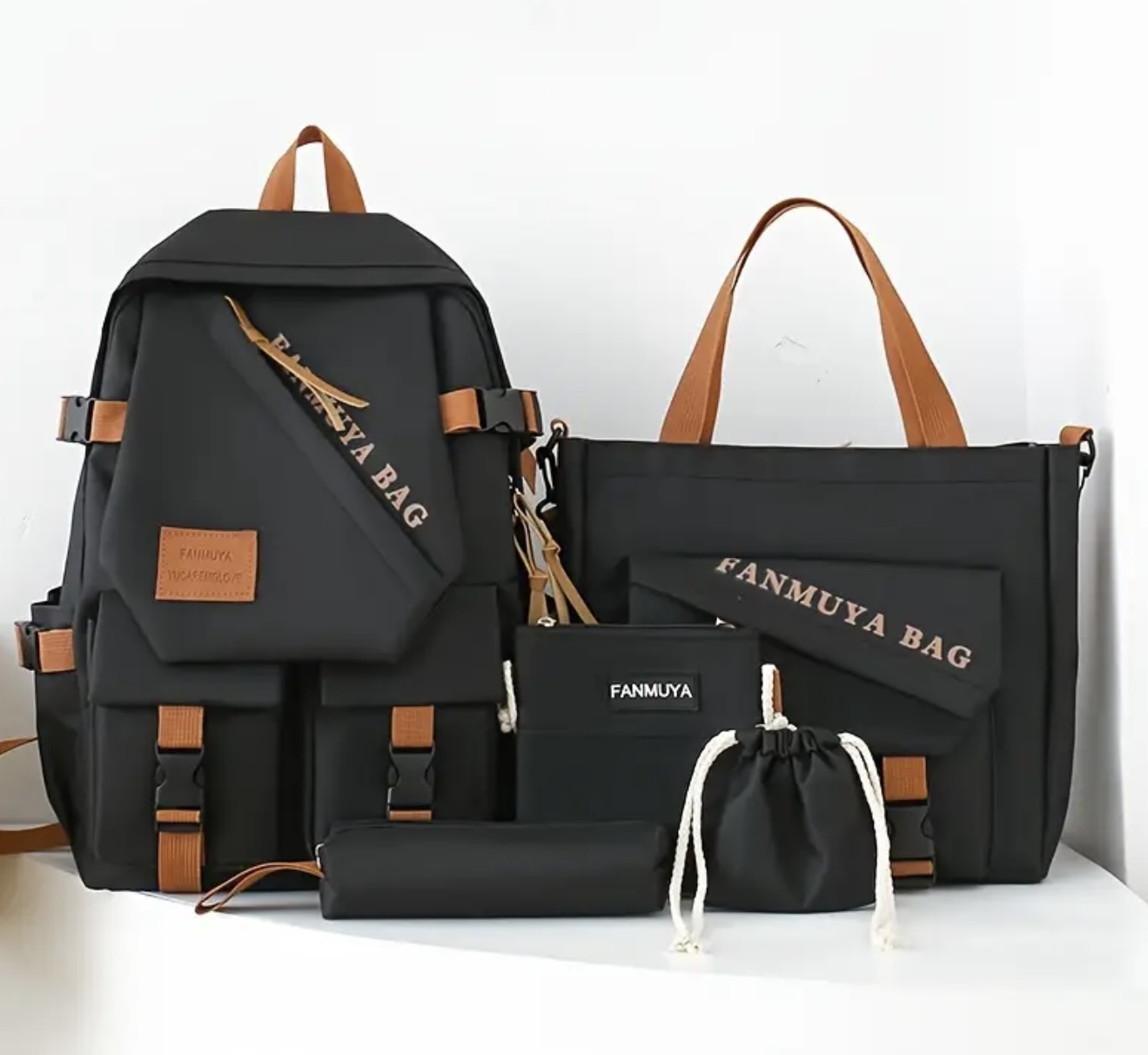 ست ۵ تکه کوله‌پشتی گرافیکی با طرح حروف – یک ست استایل پریپی و زیباشناسانه شامل کوله‌پشتی روزمره، کیف دستی (توت‌بگ)، کیف دوشی، کیف بندکشی و جامدادی، مناسب مدرسه و سفر