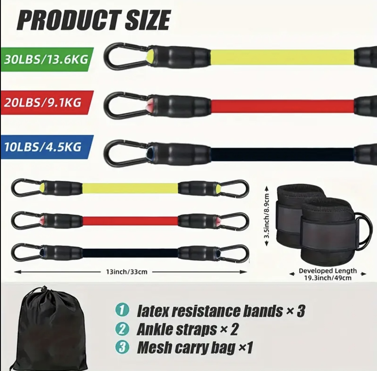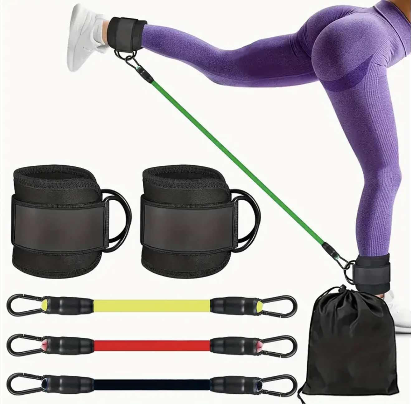 ست ۵ عددی کش مقاومتی مچ پا یونیورسال با بندهای قابل تنظیم – مناسب تمرینات قدرتی، یوگا و فیتنس، کش‌های چندمنظوره برای تمرین پا و باسن، تقویت و فرم‌دهی عضلات، شامل کیف مش برای حمل آسان